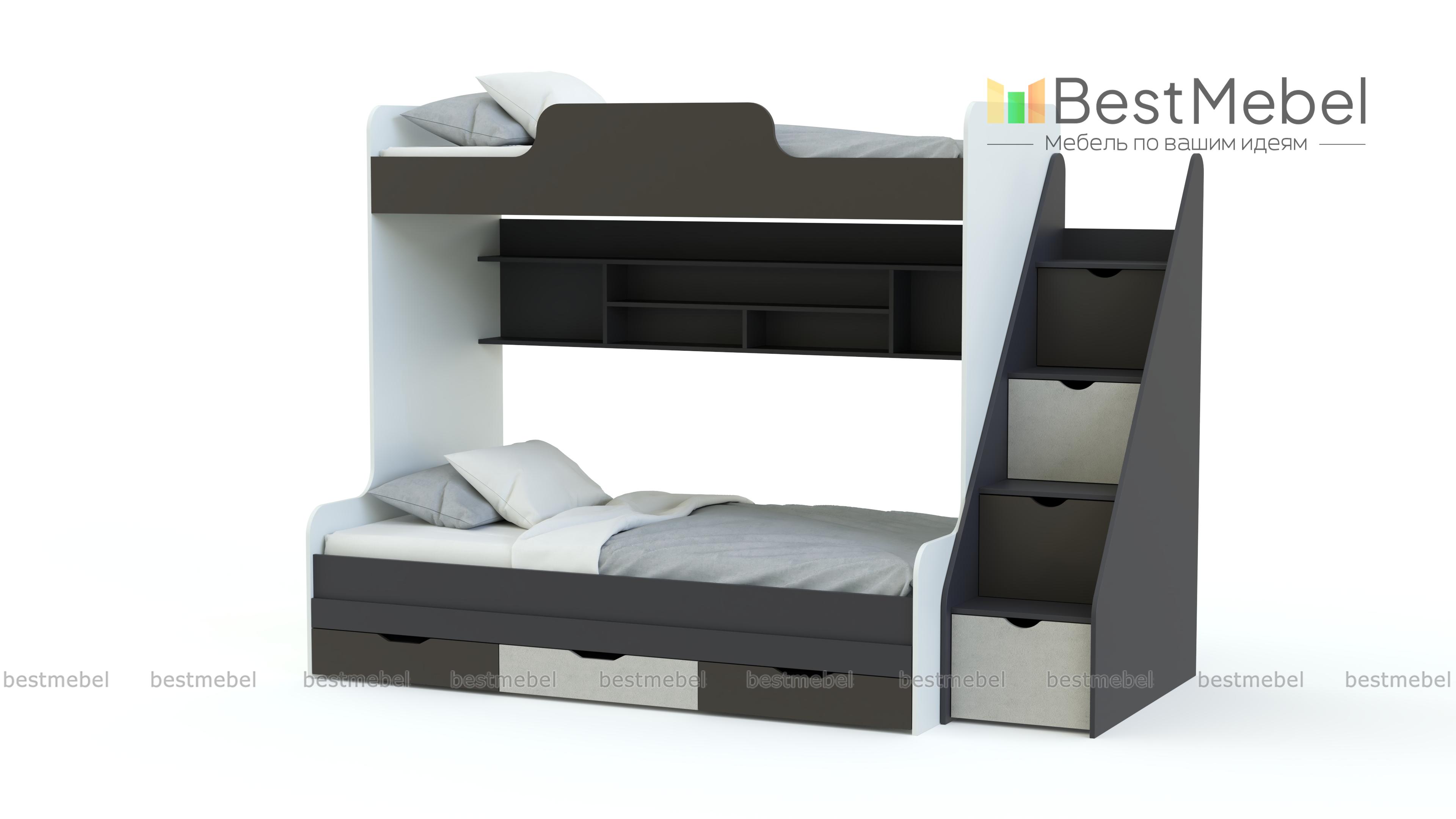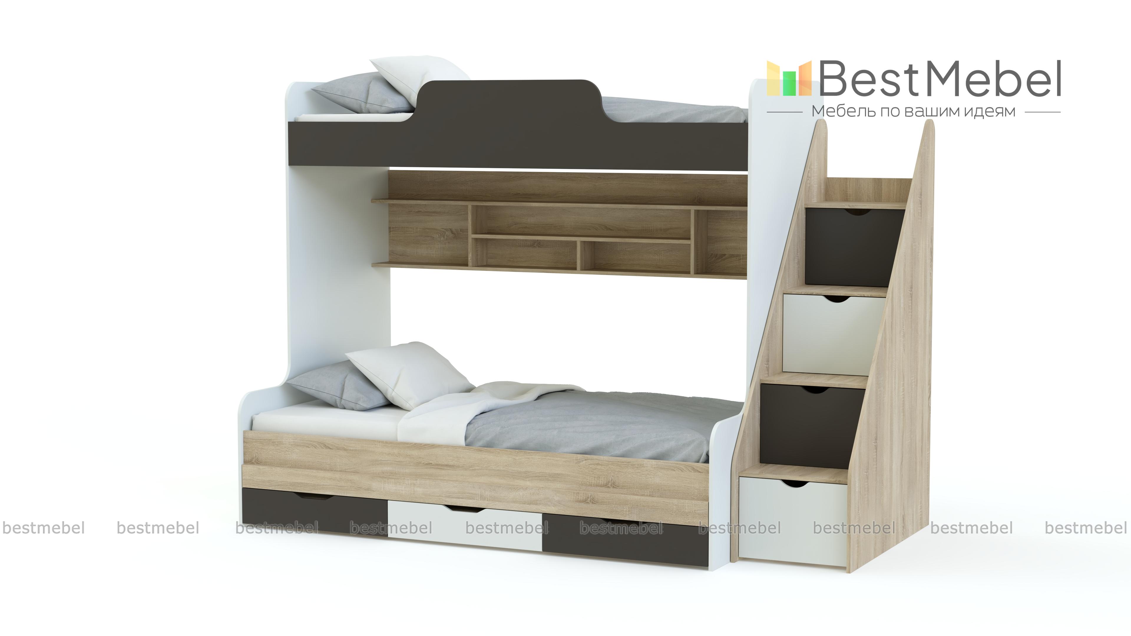 Детская двухъярусная кровать ДМ-166 BMS – продуманный вариант для комнаты, где несколько владельцев. Удобная зона отдыха организована с помощью ярусного размещения постелей (верхняя с бортиками, габариты 80 х 190 см). Задняя стенка включает многосекционную полку для книг, игрушек, личных вещей. В нижней кроватке (120 х 190 см) есть ящики. Лестница оборудована ступенями с отсеками под хранение. Композиция занимает в длину 240 см. Основной материал – ЛДСП, кромка ПВХ. Интересные детали дизайна, цветовая гамма в нескольких комбинациях.