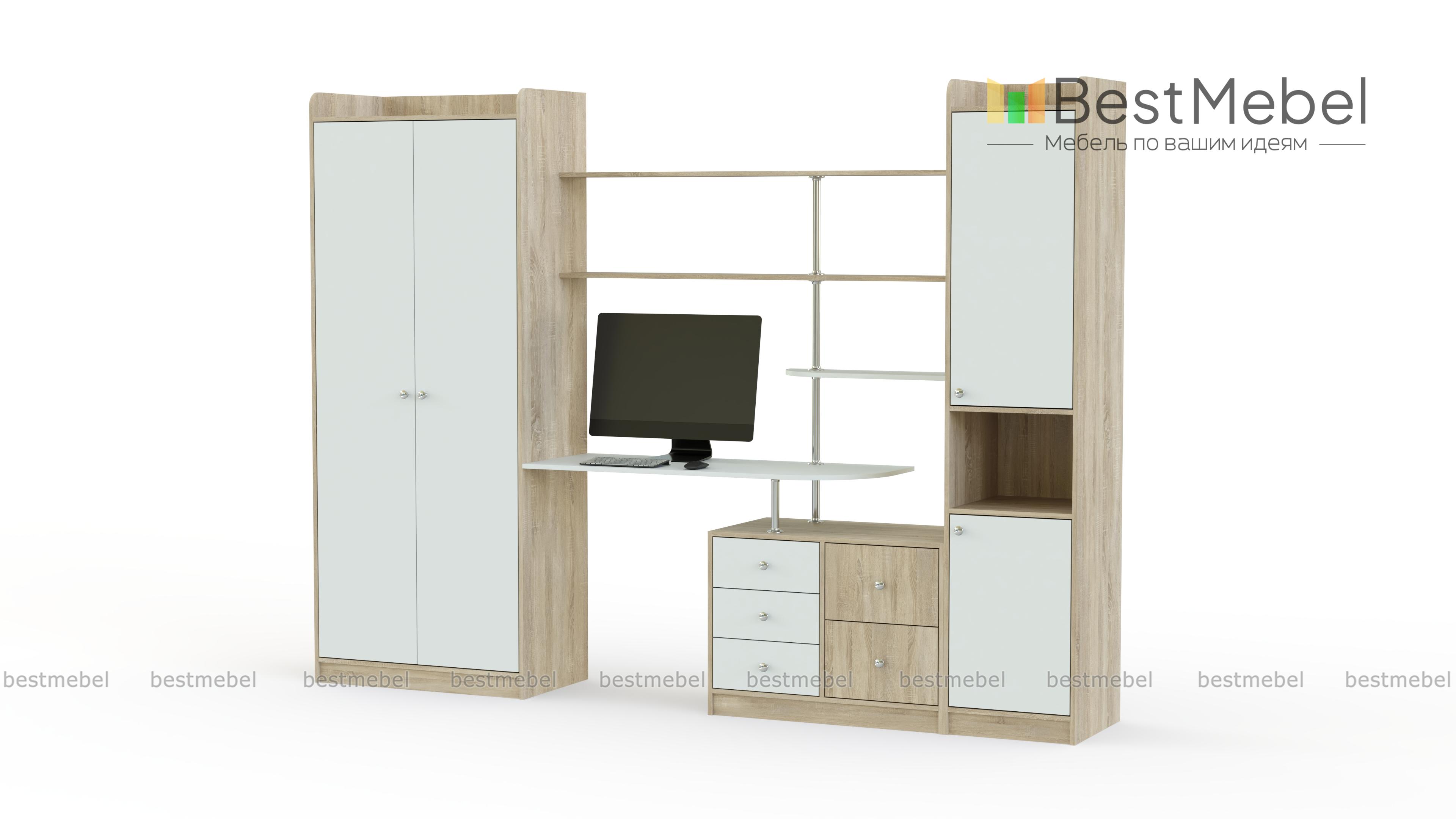 Яркий дизайн детской стенки Стайл 11 BMS не оставит равнодушными ни детей, ни взрослых. Стильная и компактная, она оборудована всем необходимым для хранения игрушек, принадлежностей для творчества и предметов гардероба ребенка. В комплекте шкаф-пенал, тумба, небольшой столик с безопасными скругленными углами, полностью открытые полки и двухдверный одежный шкаф. Наличие металлических опор делает конструкцию визуально легкой и не перегружает помещение.