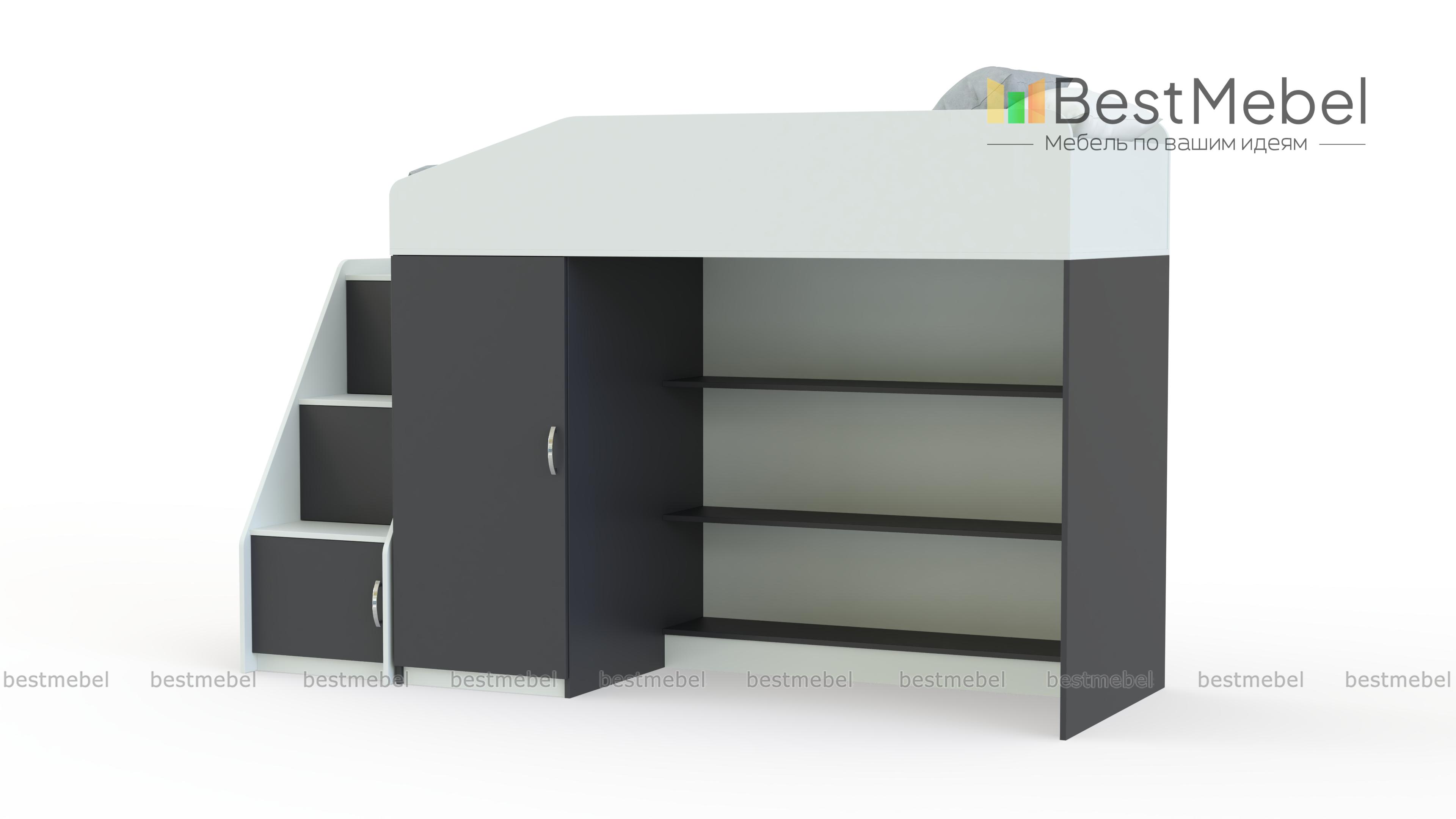Кровать-чердак Миф-11 BMS отличается комбинированной конструкцией, незаменимой в современной малогабаритной детской. Яркая модель оборудована расположенной на втором ярусе кроватью с защитными бортиками и расположенными на первом распашным шкафом для одежды и просторными полками. Завершает композицию приставная лестница-горка с вместительными ящиками под ступеньками. Скругленные углы обеспечат безопасность пользования, а сочетание древесных тонов и белых элементов создаст позитивную атмосферу. Купить кровать-чердак Миф-11 BMS приглашаем в наш интернет-магазин.