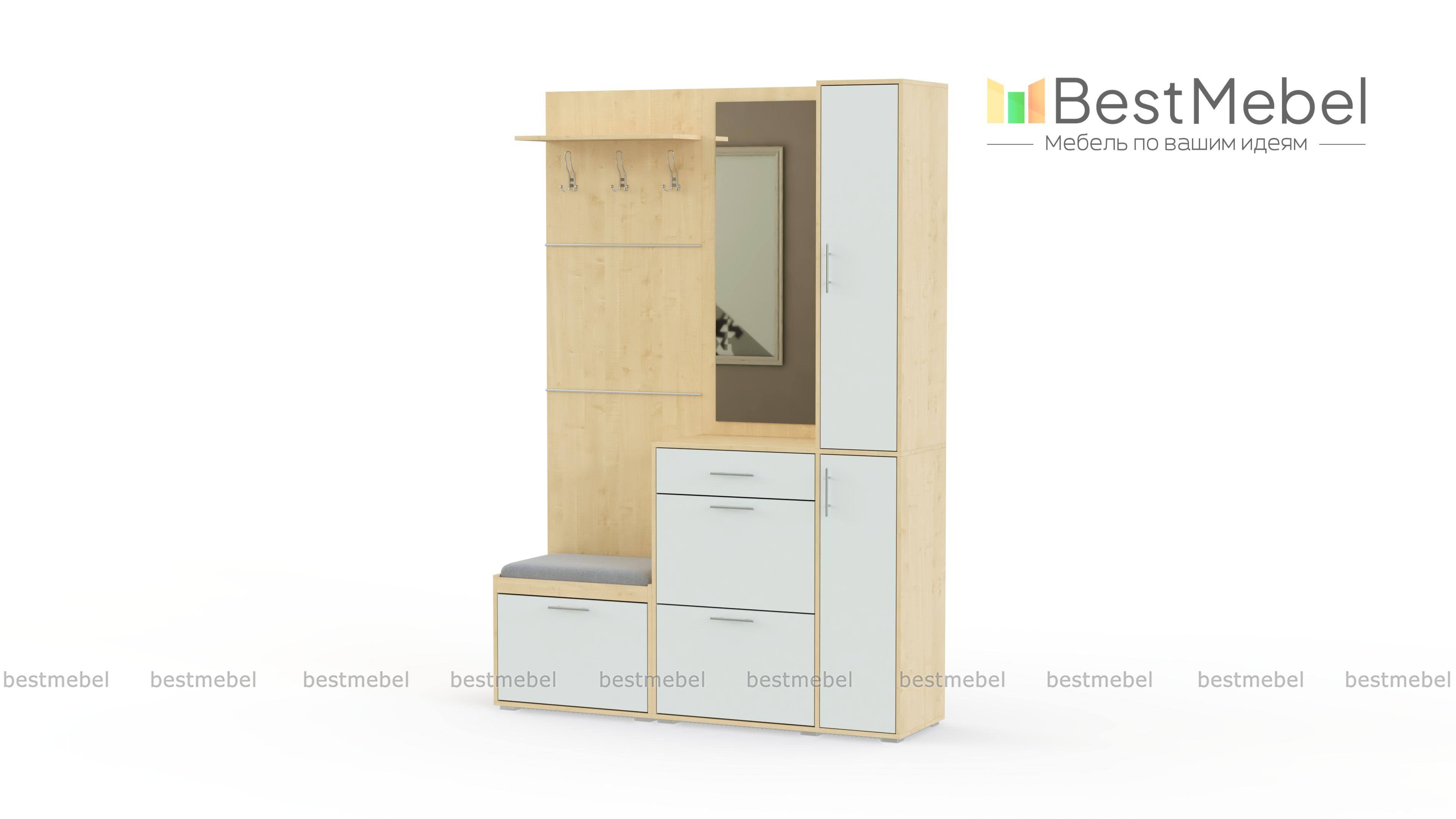 Прихожая Талисма BMS -практичный вариант для любителей все раскладывать по своим местам. Шкафчики расположены ступеньками. Самая низкая обувница с одним отделением имеет мягкую крышку, она заменяет пуфик, незаменимая помощница при обувании. Высокая тумба способна вместить минимум 8 пар обуви, кроме того у неё предусмотрен выдвижной ящик для мелочей и отделение с полками. На вешалке с крючками разместится сезонная одежда и головные уборы. Зеркальная панель дополнена шкафчиком, она универсальна и может быть собрана в зеркальном отражении. Купить прихожую Талисма BMS по низкой цене можно на нашем официальном сайте.