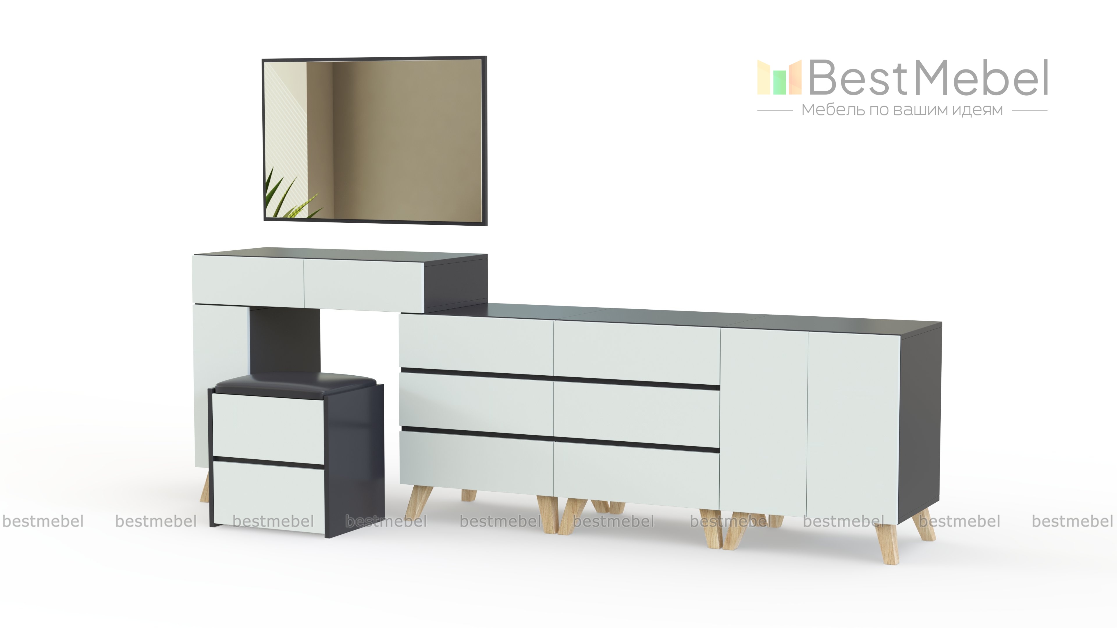 Туалетный стол Блайн 6 BMS – это комбинированная модель, которая эффектно дополнит современные минималистичные интерьеры и не только разместит все необходимое для ухода за собой, но и оформит телезону. Композиция включает в себя туалетный столик, дополненный зеркалом и банкеткой, и три тумбы – с выдвижными ящиками и распашным отделением. Визуальную легкость предметам придают высокие скошенные опоры и универсальный цвет фасадов. Купить туалетный стол Блайн 6 BMS приглашаем в наш интернет-магазин.