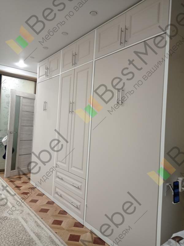 Шкаф-кровать трансформер Элли 11 BMS – элегантное решение, объединившее функции спальни и гостиной. Белоснежный шкаф выполнен в современном классическом стиле и отличается высокой функциональностью. В центре композиции располагается платяное отделение с зеркальными дверцами и выдвижными ящиками, по бокам – модули с откидными кроватями, а практичным дополнением для хранения сезонных вещей станет антресоль. Купить шкаф-кровать трансформер Элли 11 BMS и сэкономить полезную площадь вам всегда поможет наш интернет-магазин.