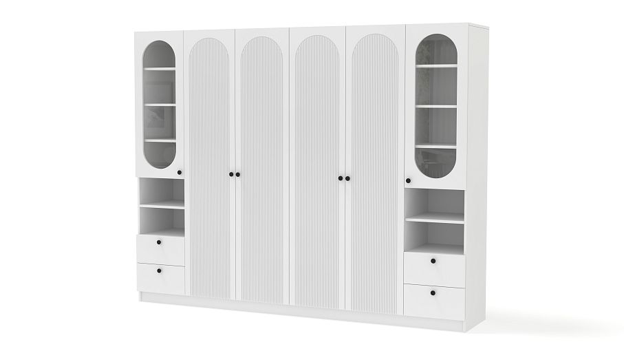 Шкаф распашной Рене 16 BMS представляет собой комбинацию двух платяных отделений в центре и двух витрин. Габаритная конструкция не выглядит громоздко благодаря светлому оттенку корпуса и фасадов, изящной фрезеровке арками и овальным вырезам. Разноплановые отделения позволяют разместить как одежду, так и книги, бокалы, всевозможные мелочи и интерьерные аксессуары. Купить шкаф распашной Рене 16 BMS вы сможете в нашем интернет-магазине с изготовлением по индивидуальным размерам.