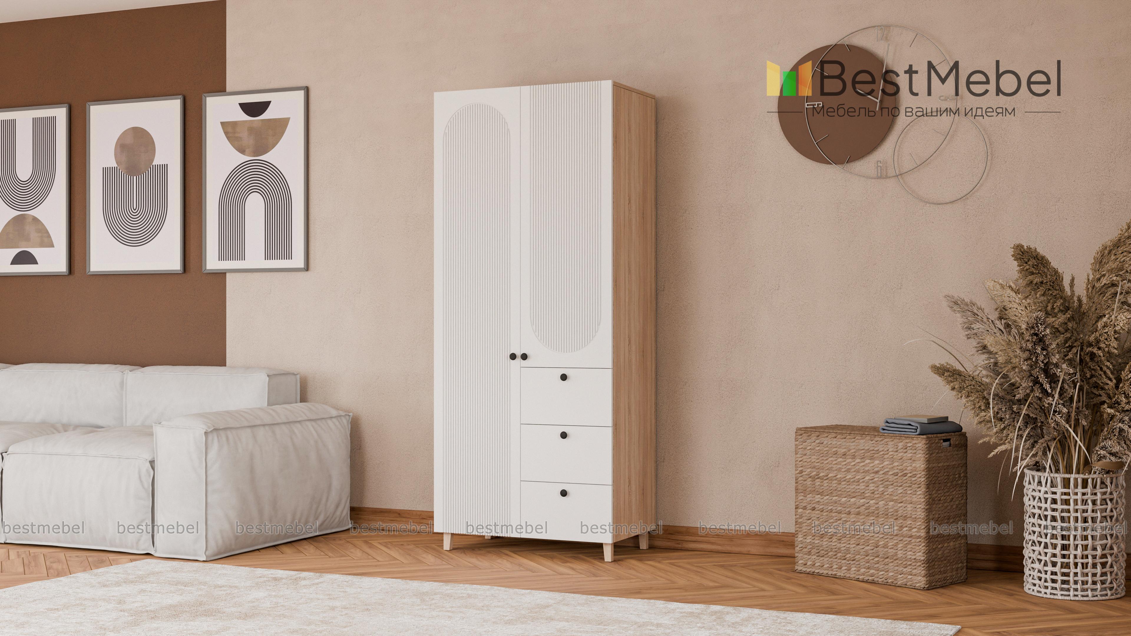 Шкаф распашной Рене 18 BMS — это небольшой гардероб, стильный и функциональный. Для хранения одежды предназначены распашные секции, а дополнение в виде трех выдвижных ящиков позволит разместить в порядке постельное белье и мелкий трикотаж. В отделке фасада шкафа использована оригинальная геометричная фрезеровка, высокие ножки добавят силуэту легкости. Купить шкаф распашной Рене 18 BMS вы всегда сможете в нашем интернет-магазине, самостоятельно подобрав цвета и размеры.