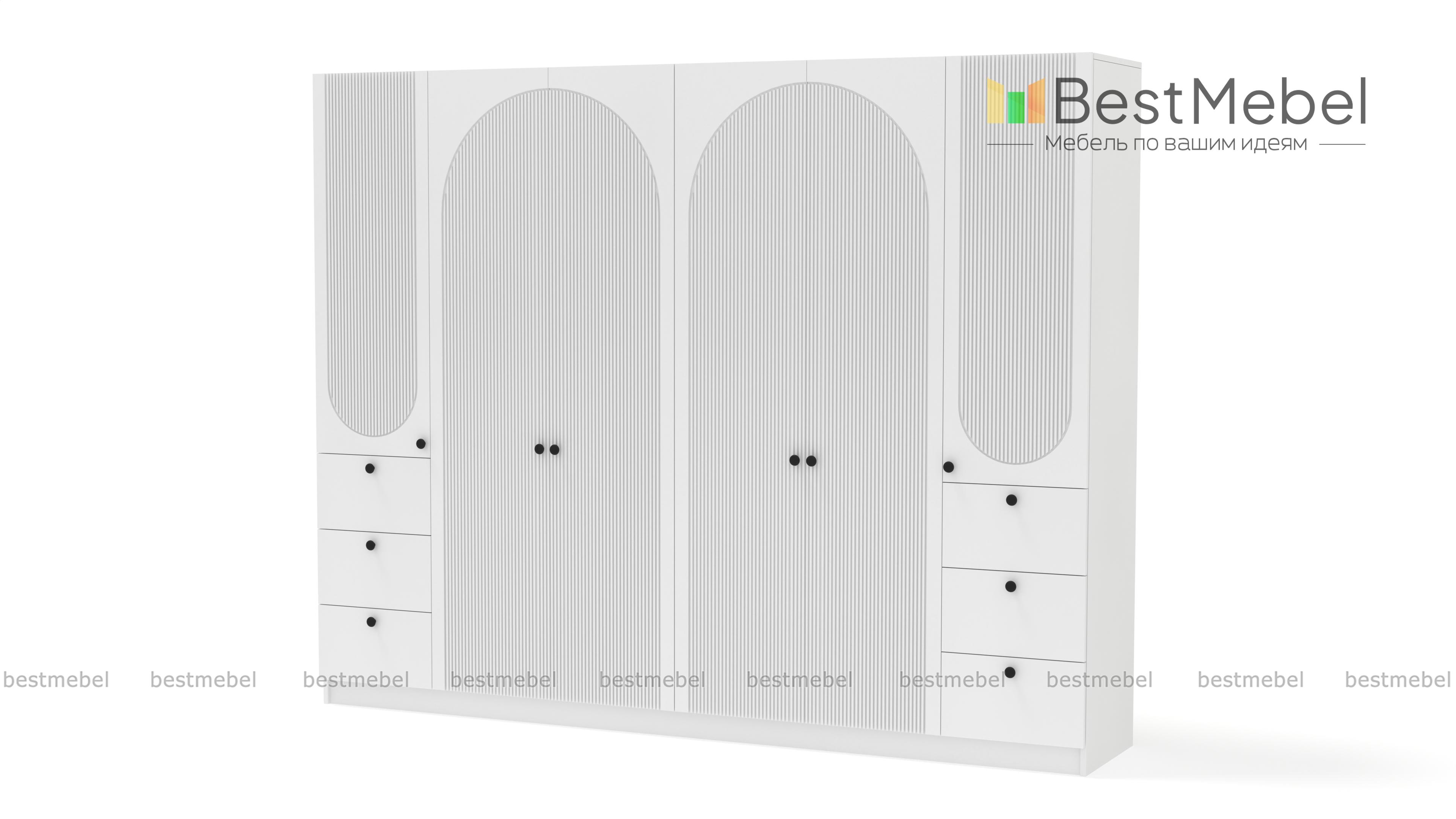 Шкаф распашной Вивьен 19 BMS с двумя платяными отделениями и двумя комбинированными легко и удобно разместит семейный гардероб. Габаритная конструкция для просторной спальни или прихожей оборудована штангами, бельевыми полками и шестью выдвижными ящиками. На фасаде из МДФ актуального оттенка — оригинальная геометричная фрезеровка и контрастные круглые ручки. Купить шкаф распашной Вивьен 19 BMS с изготовлением по индивидуальным размерам вы сможете на сайте нашего интернет-магазина.