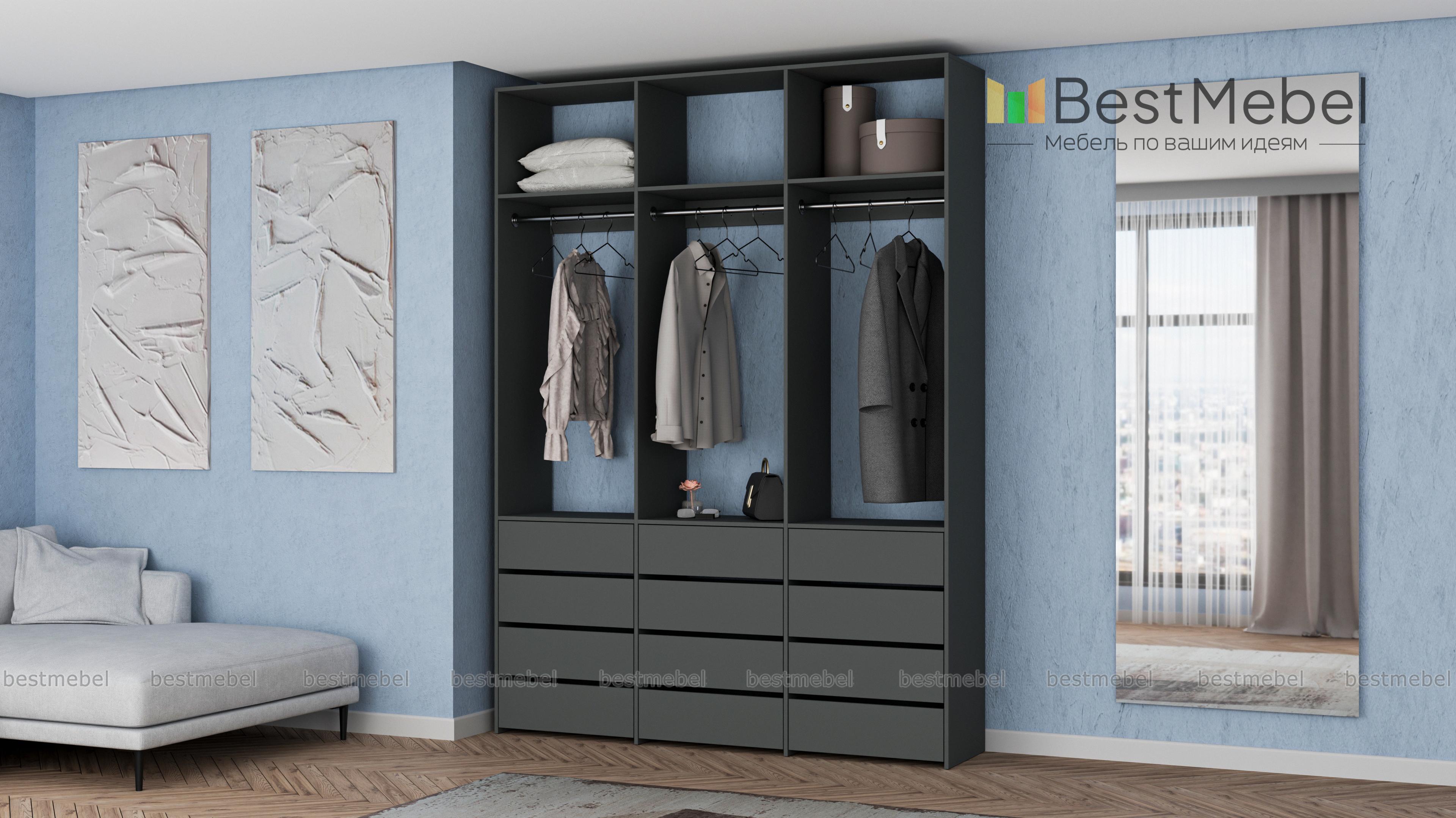 Стеллаж для одежды Мирта 47 BMS выполнен из прочной ламинированной ДСП и включает в себя три секции. В нижней части располагаются выдвижные ящики для текстиля и аксессуаров, средняя занята платяными штангами, а верхняя — полками для несезонных вещей. Минималистичный дизайн позволяет стеллажу легко вписаться в существующий интерьер. Купить стеллаж для одежды Мирта 47 BMS, изготовленный по индивидуальным размерам, вы сможете в нашем интернет-магазине.