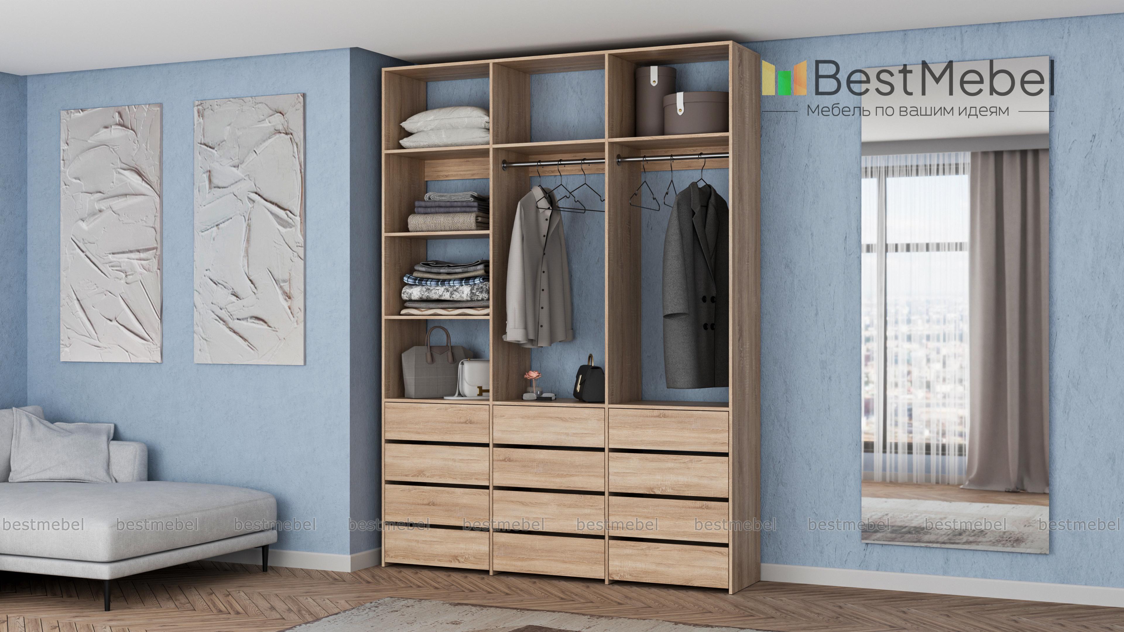 Стеллаж для одежды Мирта 48 BMS имеет минималистичный и функциональный дизайн. Трехсекционная конструкция включает в себя штанги для вешалок с одеждой, выдвижные ящики для белья и верхние полки, отделение слева для удобства также разделено двумя полками. Материал изготовления — прочная и долговечная ламинированная плита. Купить стеллаж для одежды Мирта 48 BMS, выполненный по индивидуальным размерам, вы сможете недорого на сайте нашего интернет-магазина.