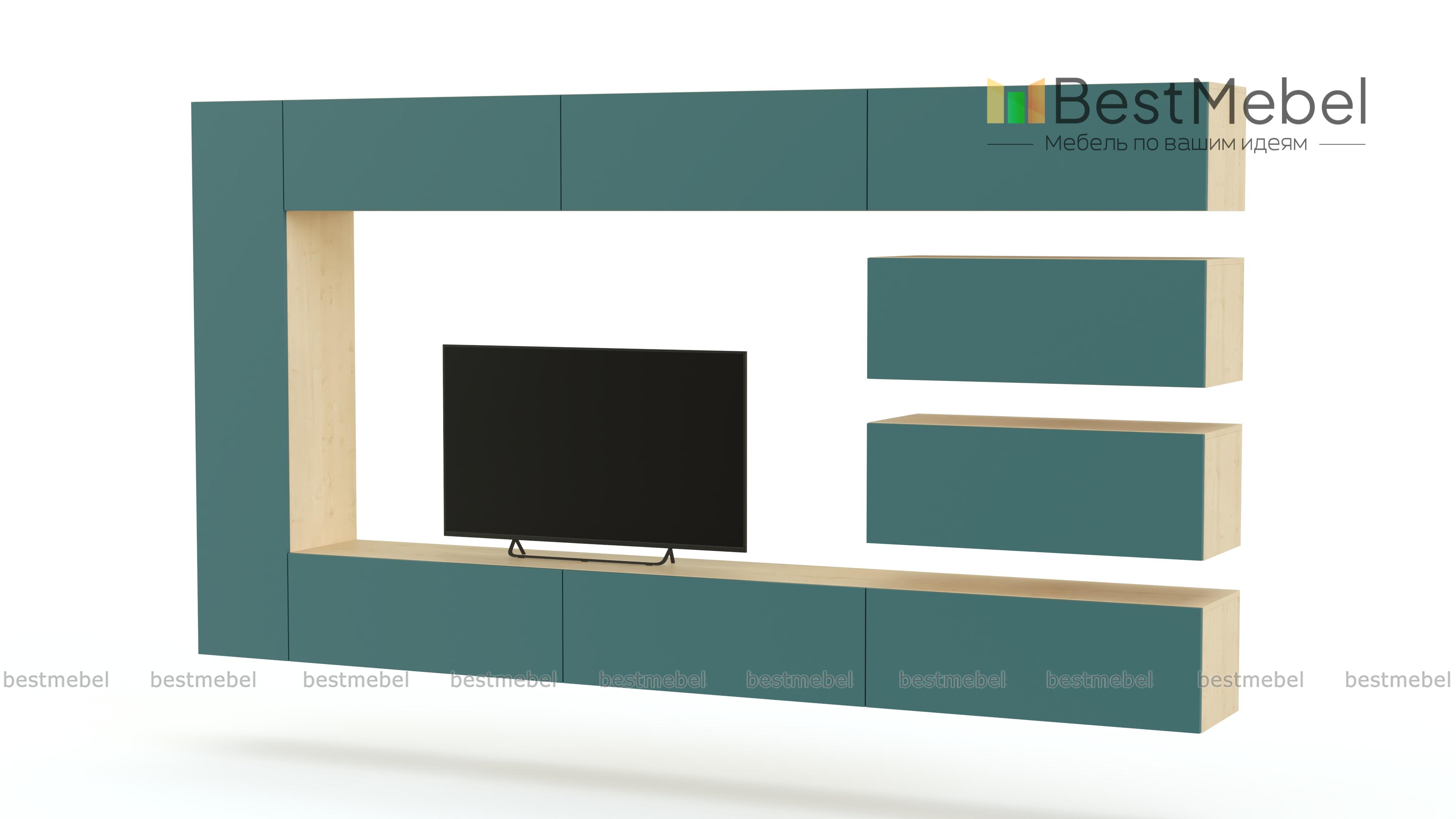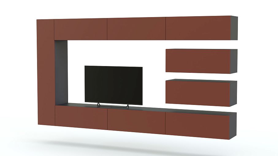 Яркая модульная композиция гостиного гарнитура Box-Plan 5 BMS займет центральное место в интерьере современной гостиной. В комплект входят семь модулей, расположенных по периметру, и образуюших в центре нишу для ТВ. Горизонтальные модули правой части закреплены на контрастной панели. Дверцы без ручек открываются легким нажатием. Фасады гостиной выполнены в роскошном матовом цвете, оптимальный оттенок которого вы сможете подобрать самостоятельно в нашем интернет-магазине.