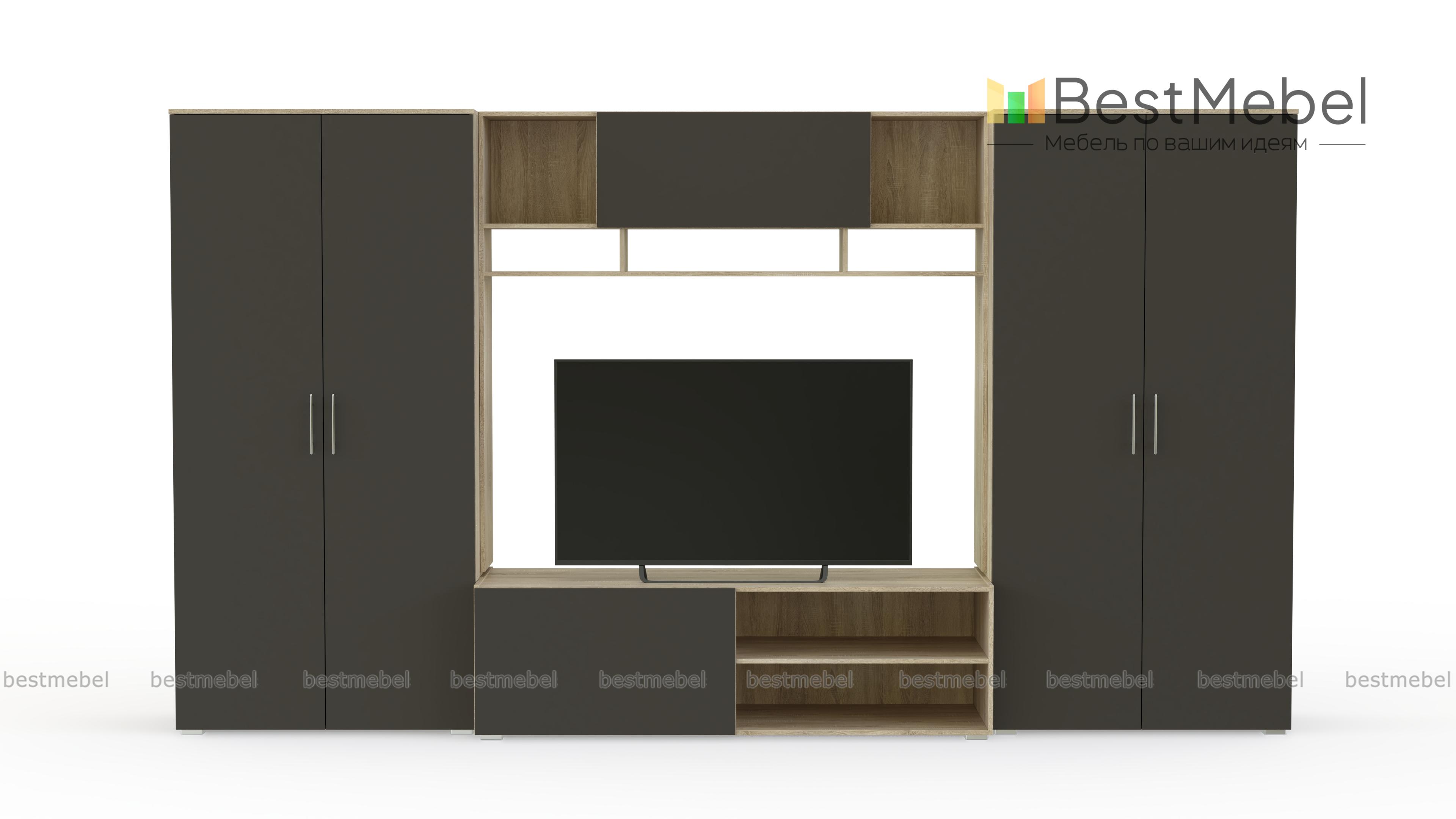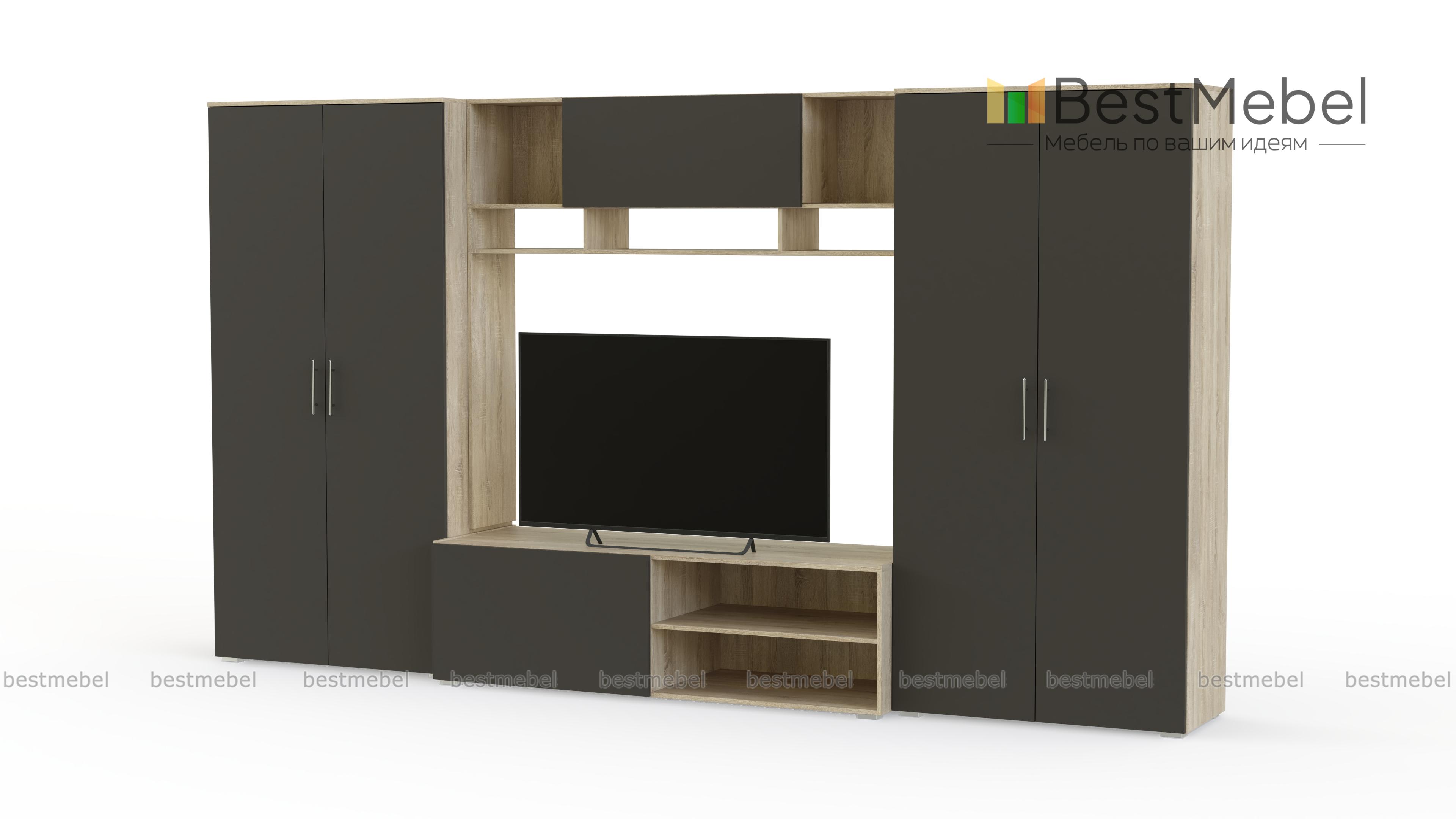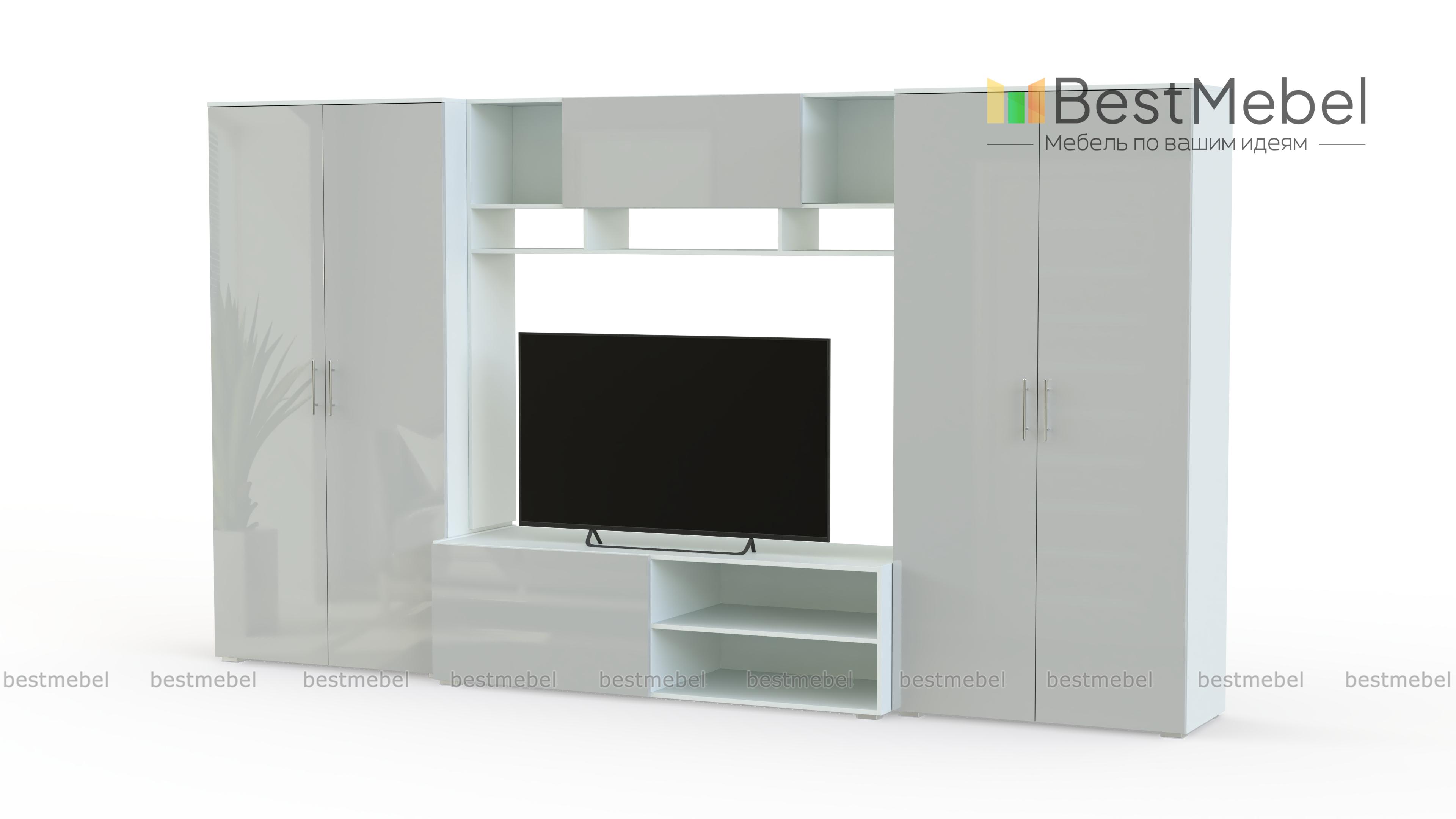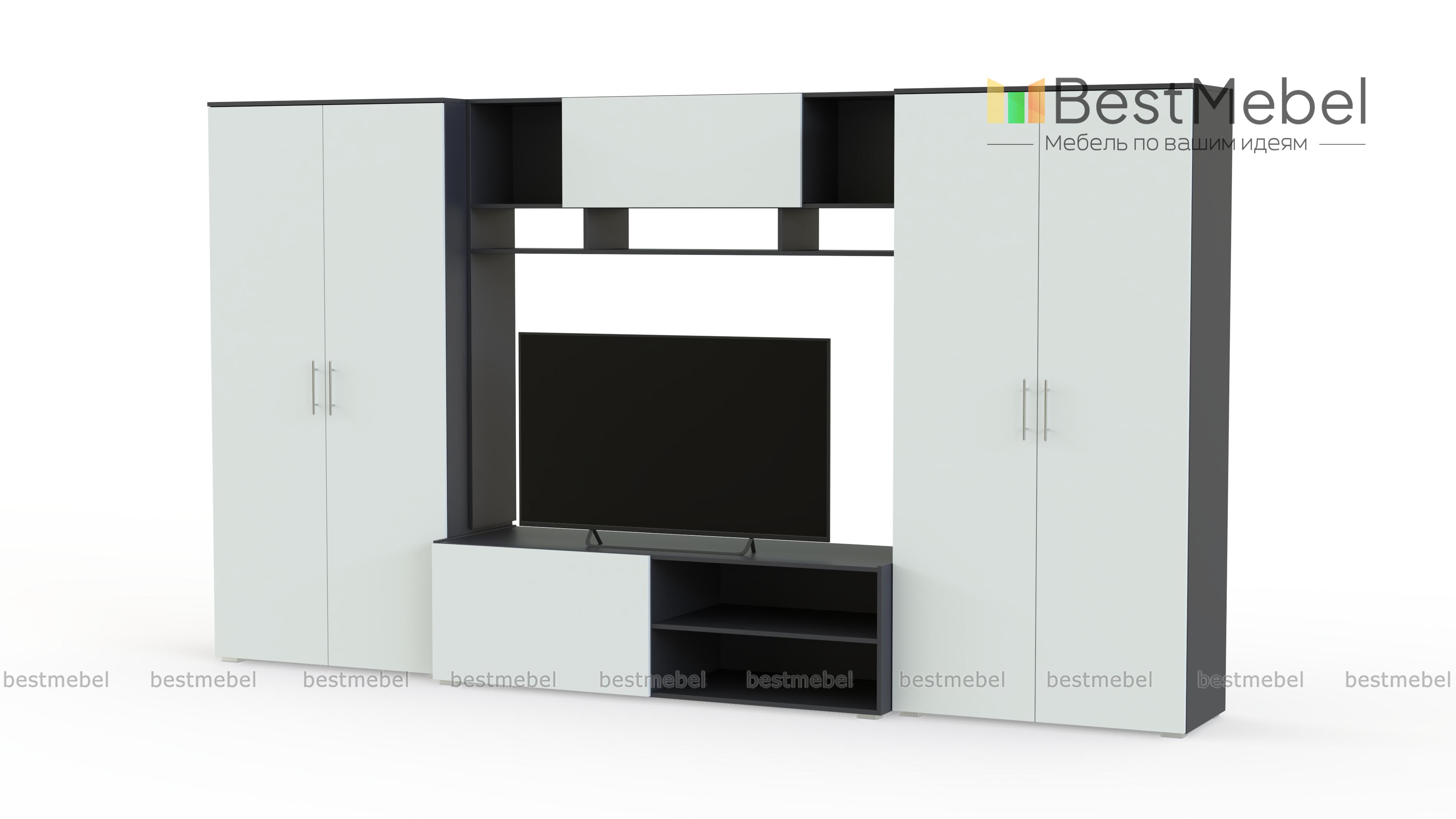 Стенка Неко 4 BMS привлекает внимание вместительностью и станет практичным решением для современной гостиной. Входящие в комплект два распашных двухдверных шкафа помогут разместить одежду на плечиках и домашний текстиль, для ТВ и дополнительной аппаратуры предусмотрена тумба с глухим отделением и нишами, а для книг и мелочей – просторная антресоль. Матовые фасады стенки добавят комнате визуального объема. Купить стенку Неко 4 BMS вы сможете в нашем интернет-магазине по отличной цене.