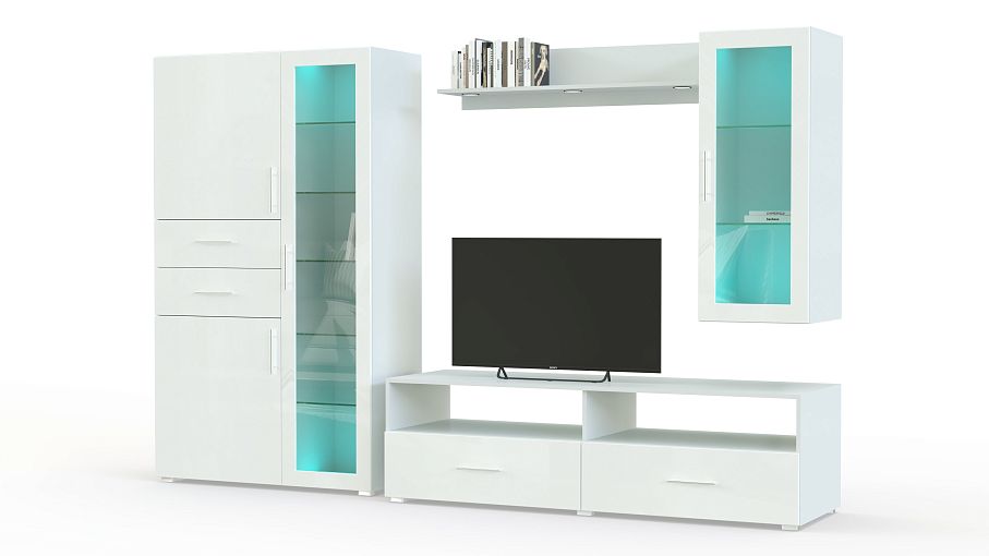 Стенка Ватсон 32 BMS поможет создать яркий, ультрасовременный интерьер в стиле минимализм. Отдельные элементы модульной композиции вы сможете комбинировать по своему вкусу и гармонично вписать в помещения любой планировки. В комплект входят тумба под аппаратуру, комбинированный шкаф с ящиками и витриной, навесная витрина и открытая книжная полка. Эффектный вид стенке придает сочетание белого глянца фасадов и встроенной подсветки. Купить стенку Ватсон 32 BMS приглашаем в наш интернет-магазин, подобрав оптимальные параметры.