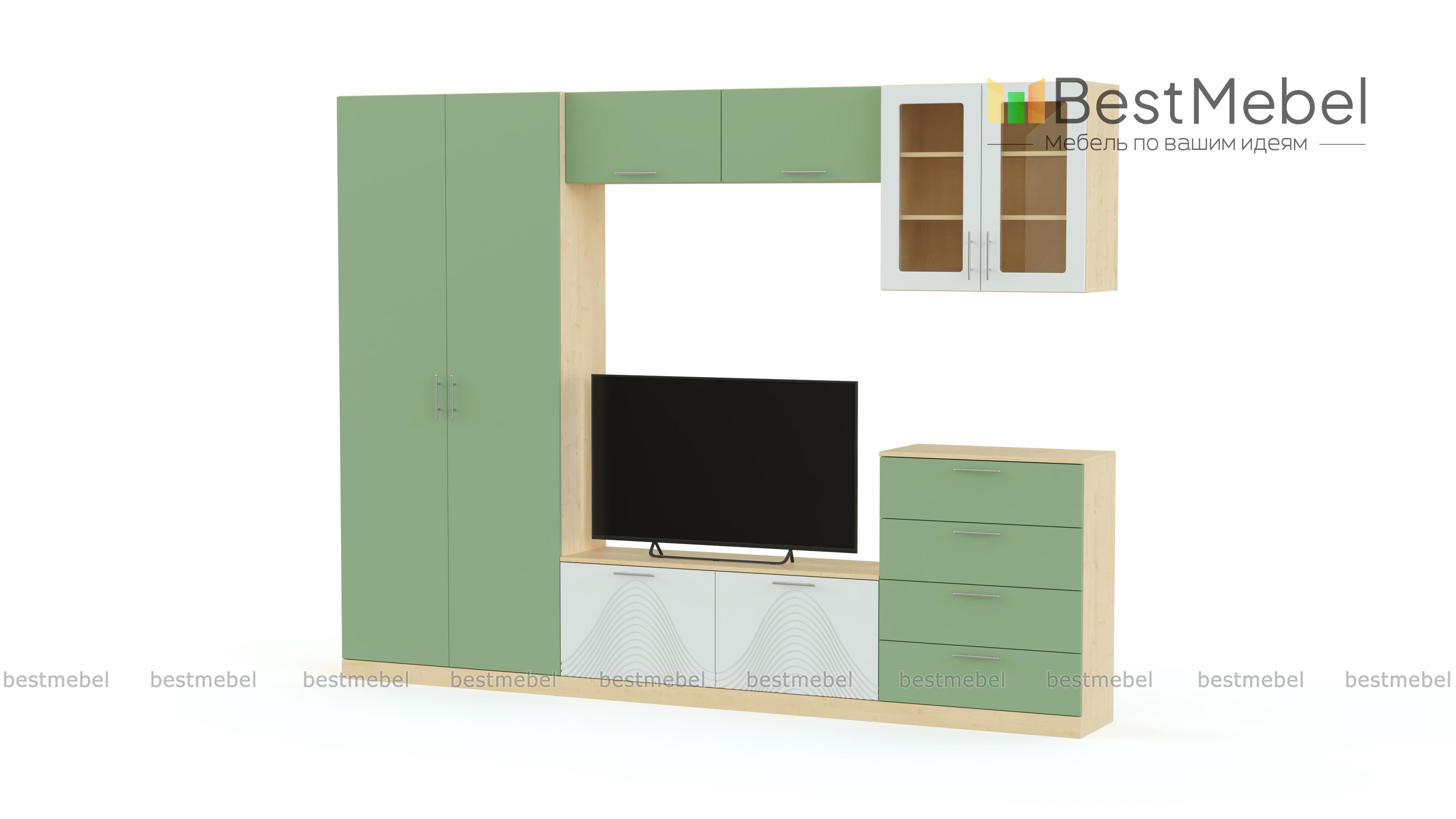 Стенка Вельвет 22 BMS – это вместительность, строгие минималистичные пропорции и свежие расцветки. Модель станет отличным выбором для создания яркого динамичного интерьера в современном стиле. Разместить все необходимое помогут практичные модули – платяной распашной шкаф, тумба под ТВ, комод с выдвижными ящиками, антресоль и навесной застекленный шкафчик. В оформлении фасадов сочетаются матовые гладкие поверхности и цветной оттенок с рельефным рисунком. Купить стенку Вельвет 22 BMS приглашаем по демократичной цене в наш интернет-магазин.