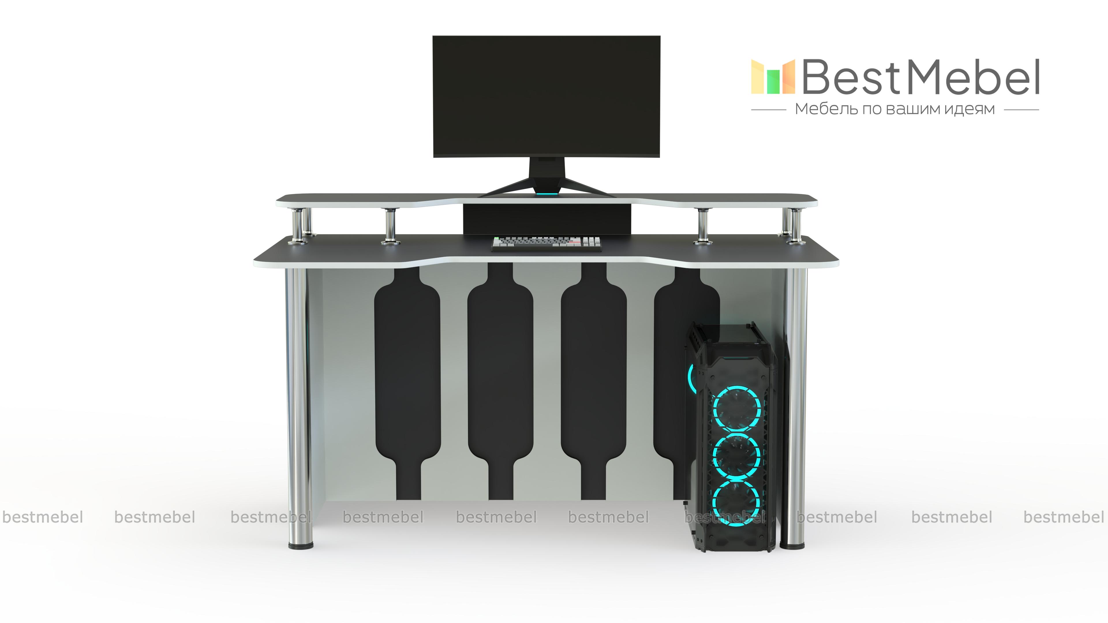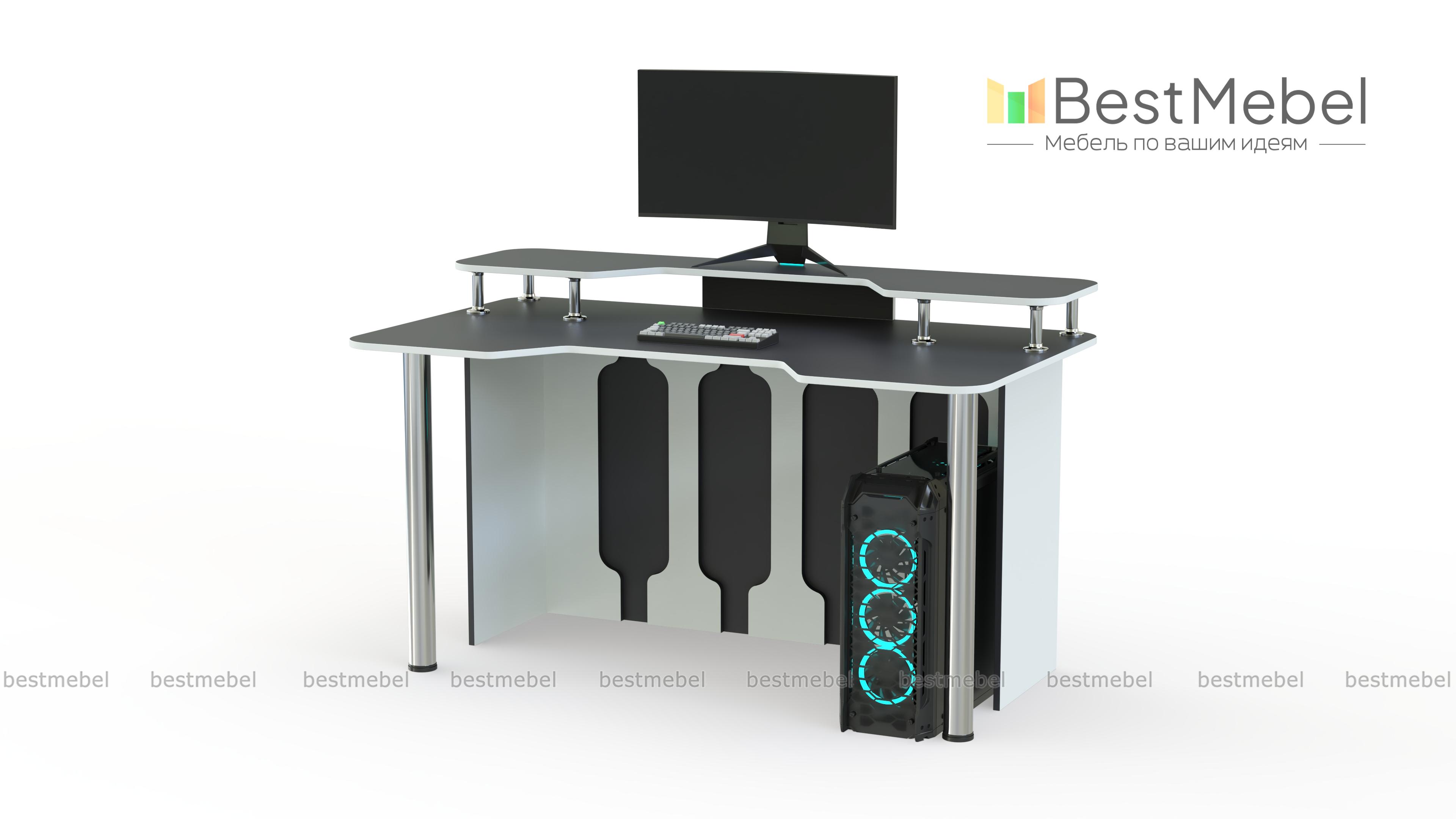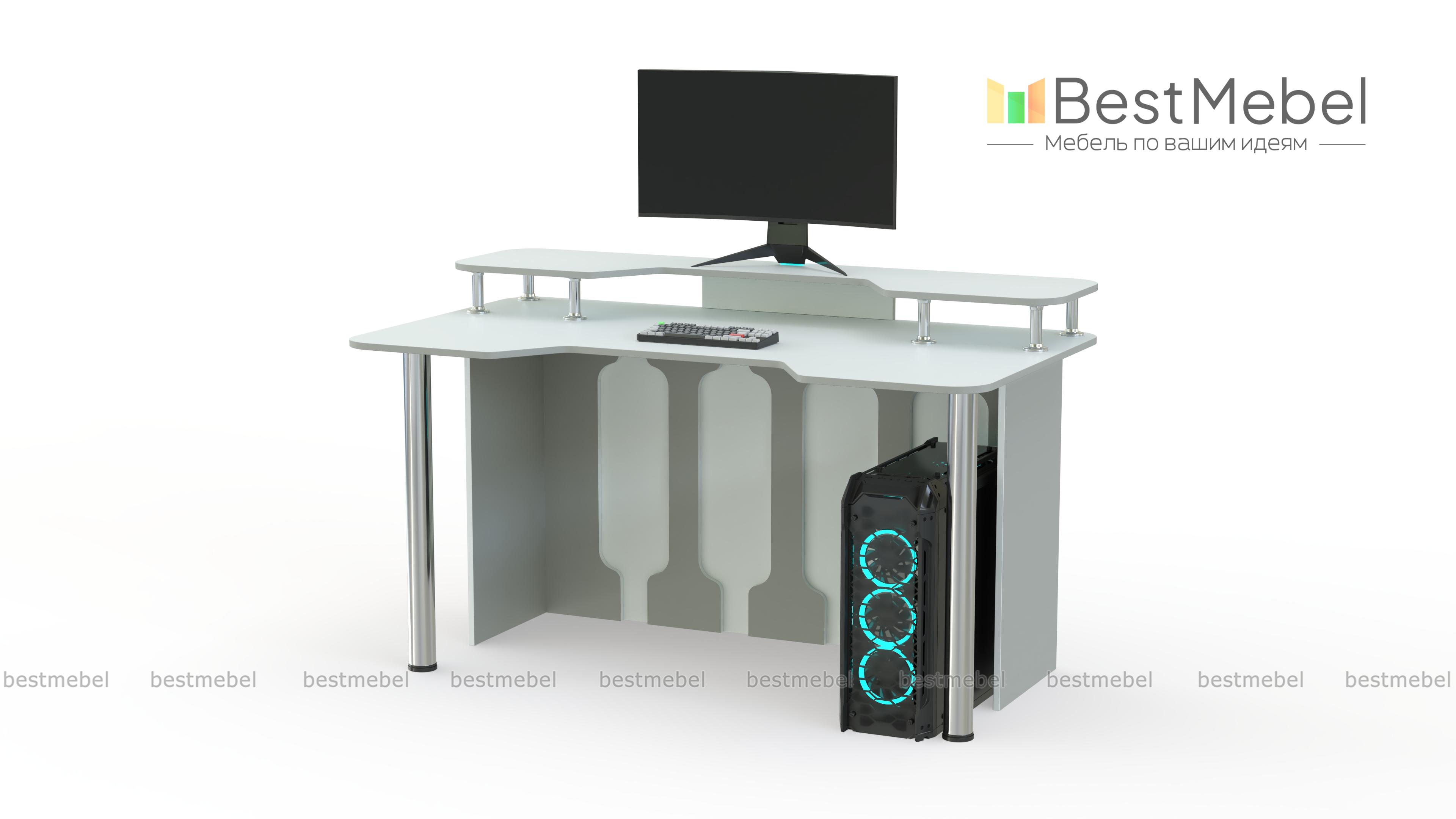 Игровой стол Стар-5 BMS позволит проводить за компьютером долгое время благодаря удобной форме столешницы. Дополненная надстройкой, она поможет разместить на удобной высоте монитор и периферийные устройства, а правильное положение тела обеспечит эргономичная выемка. Яркая модель в сине-белой гамме оборудована устойчивыми хромированными опорами и задней стенкой с декоративными вырезами. Купить игровой стол Стар-5 BMS вы сможете на сайте нашего интернет-магазина.