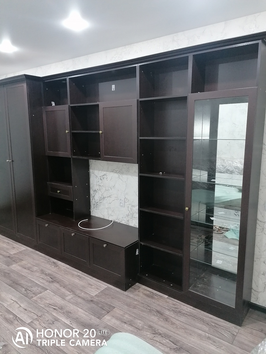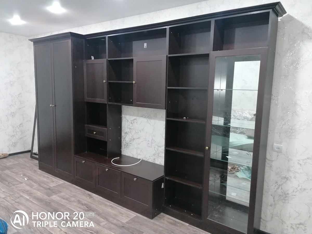 Отличная стенка! Сначала выбрал на сайте, потом заказал в демо-зале на Ярославке, куда принес с собой образцы обоев и ламината, чтобы подобрать подходящий цвет панелей мебели. Огромное спасибо сотруднице, принимавшей заказ! Она включила в заявку опорные ножки и ручки для дверей, которые не предлагались на сайте, но мне их очень хотелось Привезли через неделю. Сборка не очень простая, но и не безумно сложная. Собирать желательно вдвоем, потому что поставить верхнюю крышку в одиночку практически нереально. И две средние полки ставить одному тоже неудобно.Ну, а когда все собрано - выглядит как на приложенном фото.Рекомендую!