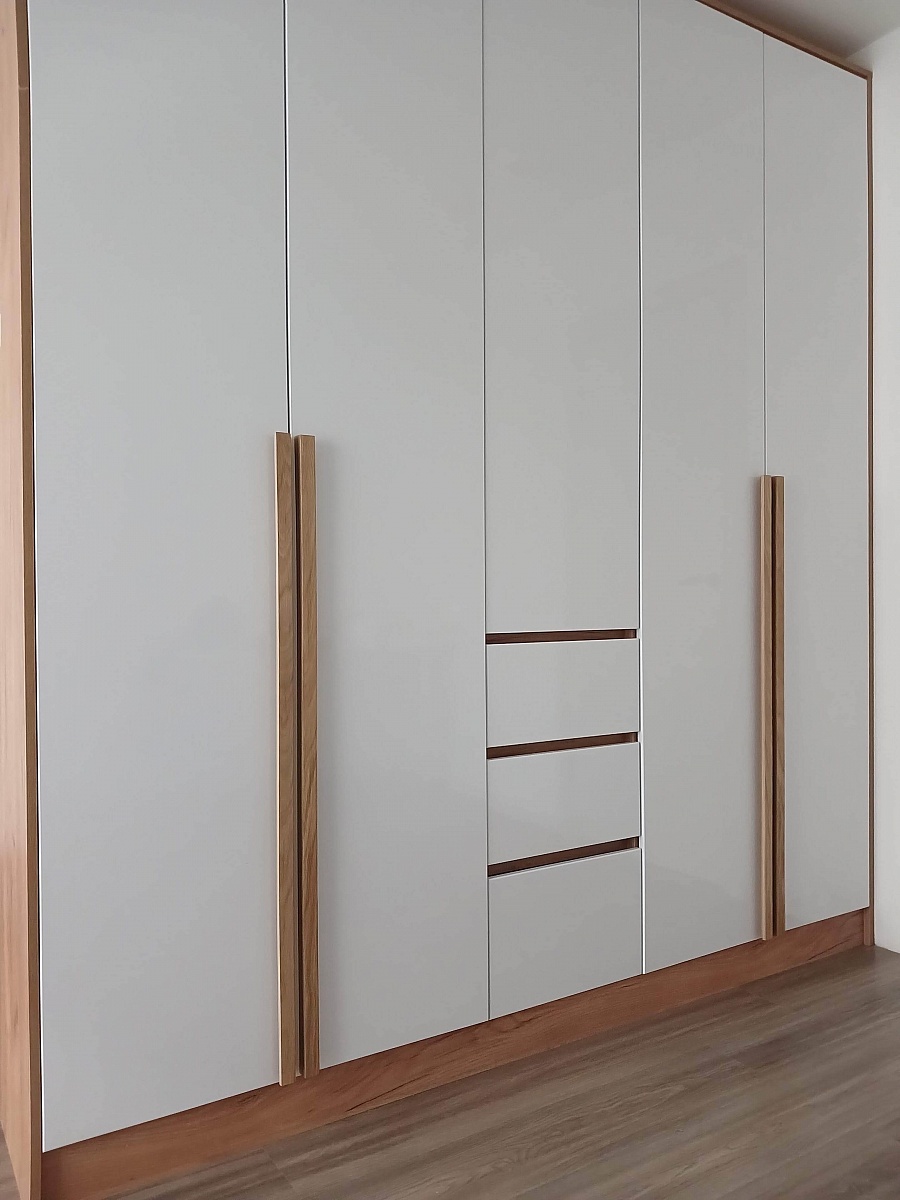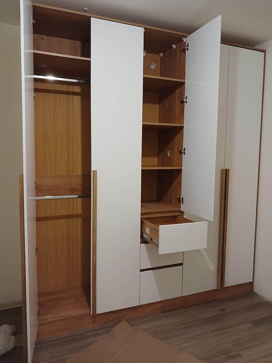 Шкаф очень красивый, дверцы с фаской, выглядит стильно. Удобный - если брать петли с доводчиком. Единственный недостаток проекта - ручки дверей, 120 см, это просто палка из лдсп, установленная ребром на фасад, с кромкой по внешней стороне, выглядит хлипко и установлена только на половине дверей, неудобная и непрактичная идея, поэтому сразу заменили на г-ручки из массива дуба - и за эти лдсп минус звезда в качестве. И, пожалуй, сейчас я бы взяла ещё и две дополнительные полки в широкие отделения, свободное место для них там есть. Заказывали на 25 см уже стандарта. Всё сделали быстро. Изготовили за неделю - привезли в спб сразу, в течение недели довезли фурнитуру и забытые фасады ящиков. Ничего не было побито, упакован очень хорошо. Сборщика от магазина пришлось подождать, но не пожалели, что не собирали сами - некоторые присадочные для саморезов петель были не там, а местами соединения было невозможно реализовать из-за ракурса сборки - уголки по факту заменили на дополнительные конфирматы.