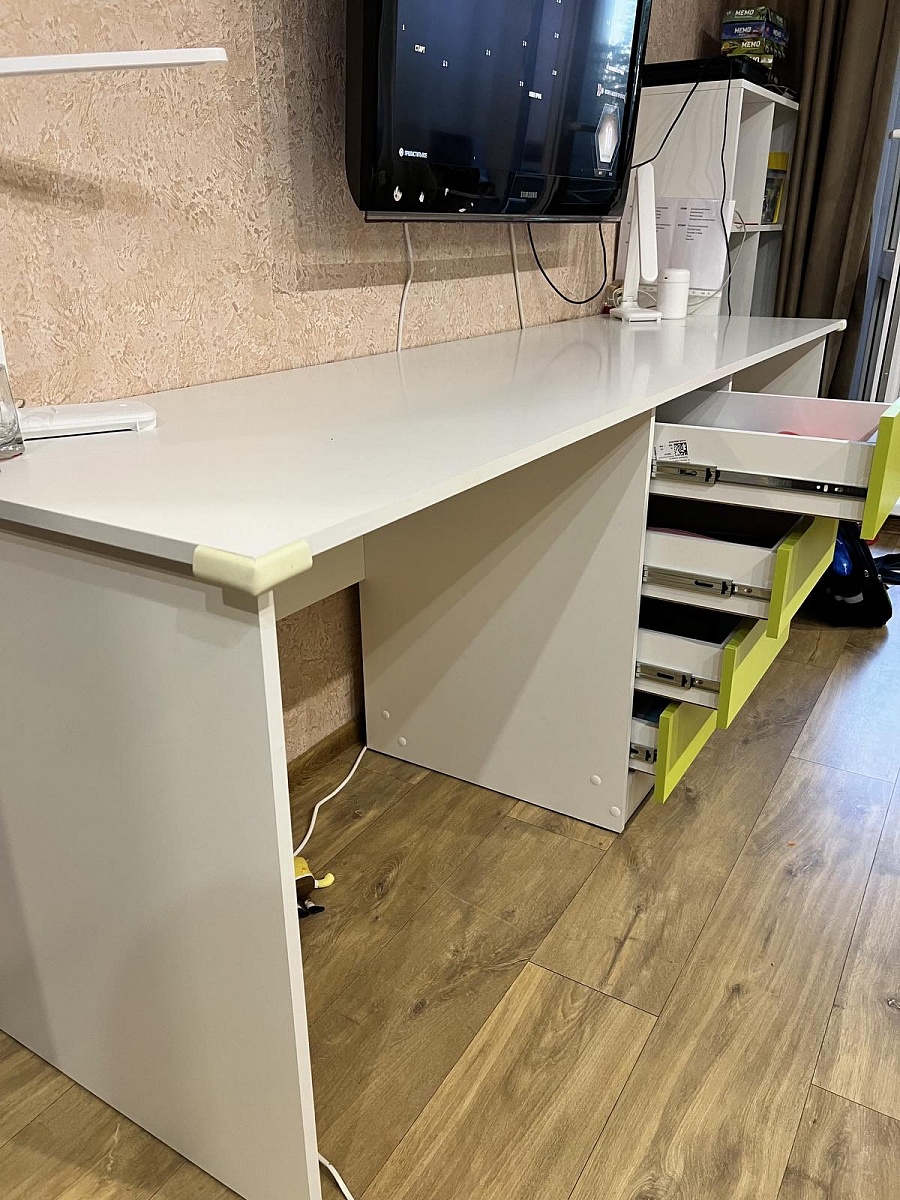 Удобный стол. Сделали при нашим размерам, стеклянную дверку заменили на деревянную, изменила расположение. Доставка вовремя. Собрали сами.