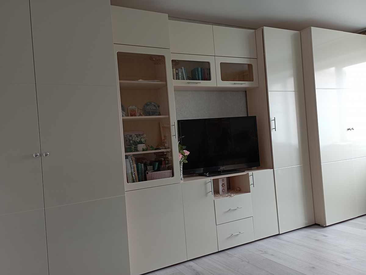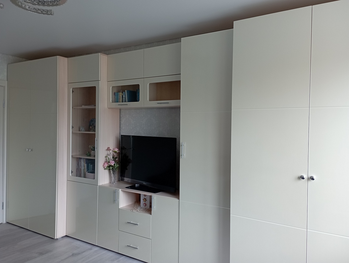 Отличный вариант. Получилось во всю длину стены. Максимальная вместимость, функциональность и современный внешний вид.