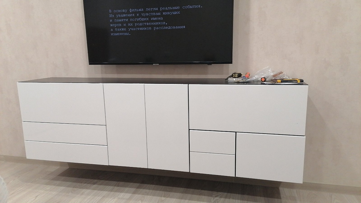 Комод заказывали под свой размер, корпус черный, фасад белый глянец. Что говорить, молодцы ребята. Очень быстро, качественно, без сколов и косяков. Немного дешевая фурнитура (толкатели и направляшки), но это все можно поменять или сразу выбрать другую при оформлении заказа. Все детали промаркированы и подписаны, сборка и крепление к стене достаточно простые. Спасибо большое продавцу!!!