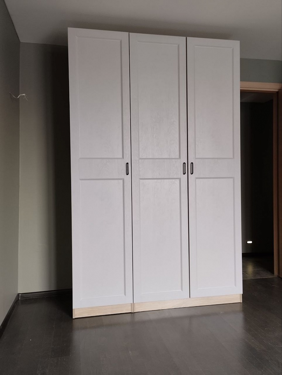 Шкаф хорошего качества, прочный. дефектов не обнаружено. Доставили вовремя в полной комплектации. Заказывали модель в стандартных размерах, выбрали с полками и отделением со штангой . Шкаф состоит из двух отдельных шкафов: двустворчатой секции и одностворчатой. Они потом свинчиваются между собой. Отверстий для соединения не было (просверлили самостоятельно). Таким образом,секции можно поставить в разных местах - это удобно, если захочется переставить мебель))! Так как собирали самостоятельно, возникли трудности с отсутствием инструкции - ее нет! Есть только схема с номерами деталей и таблица. Все элементы пронумерованы. Метизы упакованы в пакете все вместе. В принципе, разобраться можно, если есть опыт сборки мебели. Хоть шкаф и называется "Пакс", но родная икеевская инструкция  не подходит, другие способы крепления. Результатом и качеством остались довольны(Заказ 00000637096, изделие ЭСКИЗ Шкаф распашной Пакс Гримо Pax Grimo 5 (1500х2360х600) (Белье - Платье - Белье (5 полок) (3))