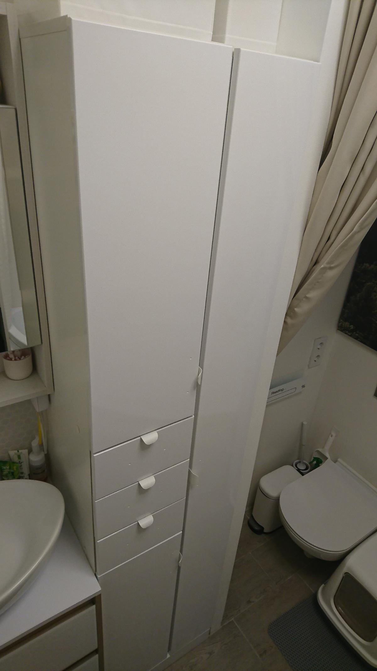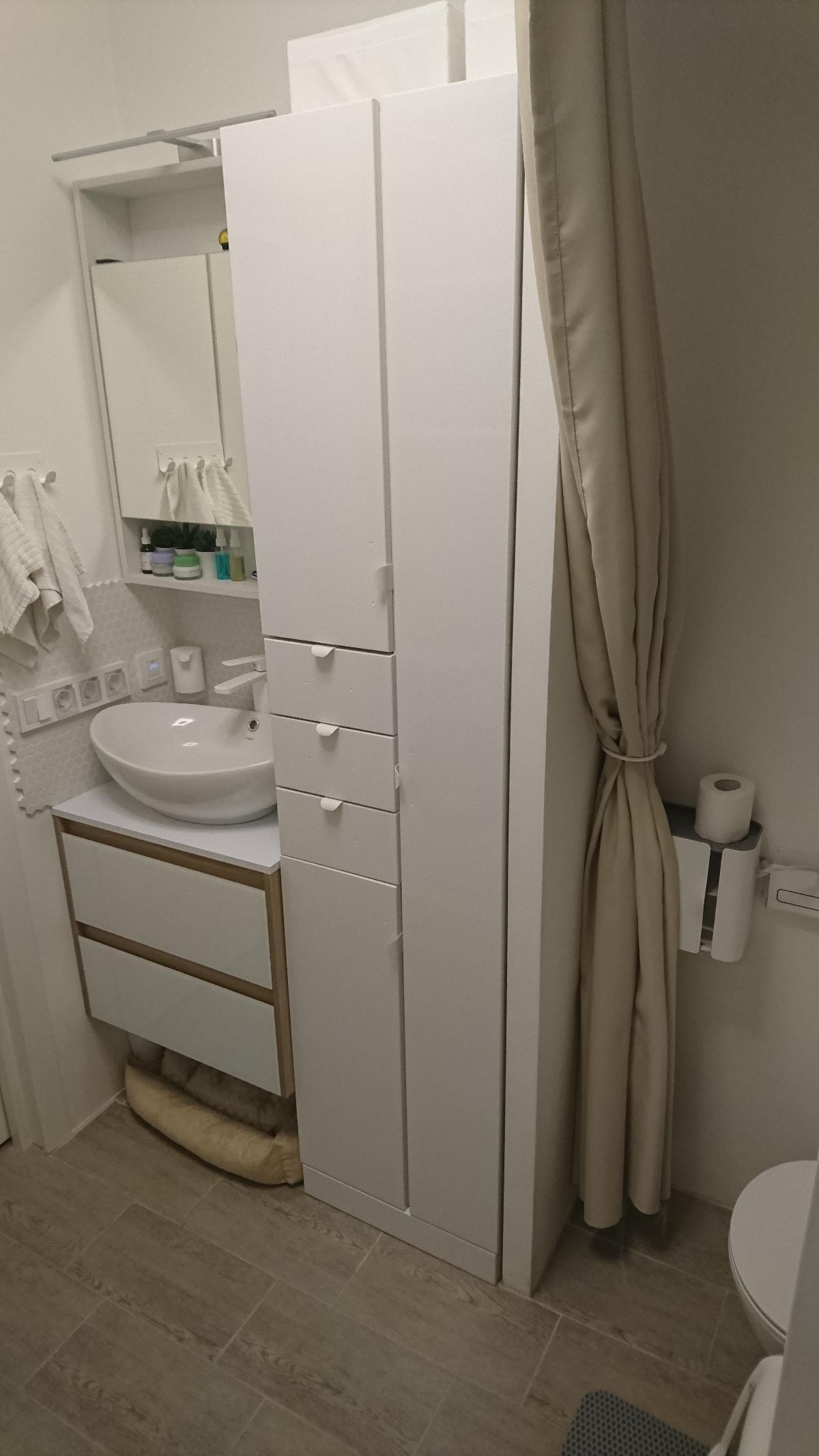 Этот шкаф идеально подошёл на своё место благодаря настройке размеров изделия. Точность изготовления позволила выдержать минимальные зазоры между стеной и раковиной. Вот уж действительно встал как влитой!Стандартные, самые недорогие ручки после примерки решено было заменить на более компактные "лепестки", чтобы меньше цепляться одеждой и взглядом (потому они и белые). Фурнитура очень качественная и солидная (при формировании заказа есть из чего выбрать, заказ 00000423546).