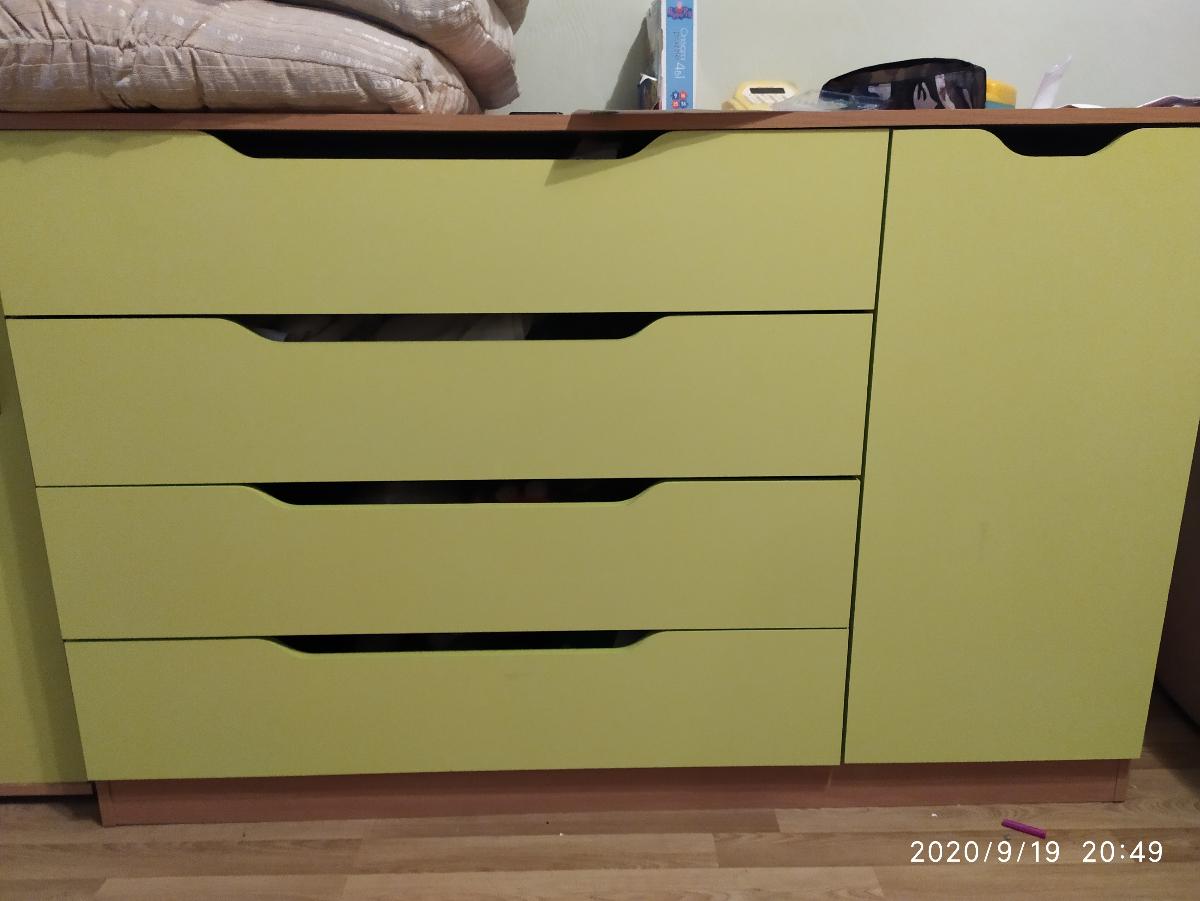Заказала Комод К-4м BMS Ширина: 1400 Высота: 900 Глубина: 480 Цвет корпуса: Бук Бавария Цвет фасадов Зеленый Лайм,  нужен был к дополнению наших шкафов в детской, просто отличный комод на "5"! Сборка точно по инструкции, без заморочек.  Спасибо продавцу за возможность выбора своего размера и цвета. PS простите за беспорядок на фото))...дети..