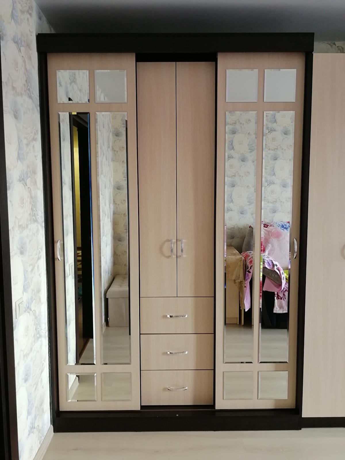 Преобрели шкаф Комфорт 6 BMS в январе 2020г. (заказ 00000338610 от 10.01.2020). Мне давно приглянулась такая модель, которая сочетает в себе распашной шкаф и шкаф-купе, присматривала в магазинах, но муж нашёл кучу недостатков: щели между створками, шумы при открывании и т.д., а самый главный конечно цена. На сайте BestMebelShop нашла такой шкаф и влюбилась в него, да ещё с возможностью выбора нужных размеров! Не смогла не заказать по такой цене, доставка бесплатная, а собирал муж сам. Инструкции по сборке нет, поэтому пришлось попыхтеть, а доводили до ума самостоятельно: муж купил самоклеящиеся мягкие полоски на дверки-купе, с ними дверки открываются бесшумно, ну и спрятались небольшие щели. При выборе данной модели нужно учесть, что распашные дверки в центре, а также выдвижные ящики открываются только при полностью закрытых боковых дверках-купе, нужно иметь это ввиду если это может создать вам неудобства. В нашем шкафу мы выбрали компановку с выдвижной штангой по центру и полками по бокам. Из недостатков я бы выделила то, что на каждой детали шкафа на лицевой стороне наклеены заводские наклейки, которые очень тяжело снимаются. Я решила проблему с помощью фена и жидкости для снятия лака. Вместе с этим шкафом приобрели стенку Макарена с такой же фурнитурой и в той же цветовой гамме. По моему получилось неплохо. В общем шкаф шикарный, всем рекомендую!👍