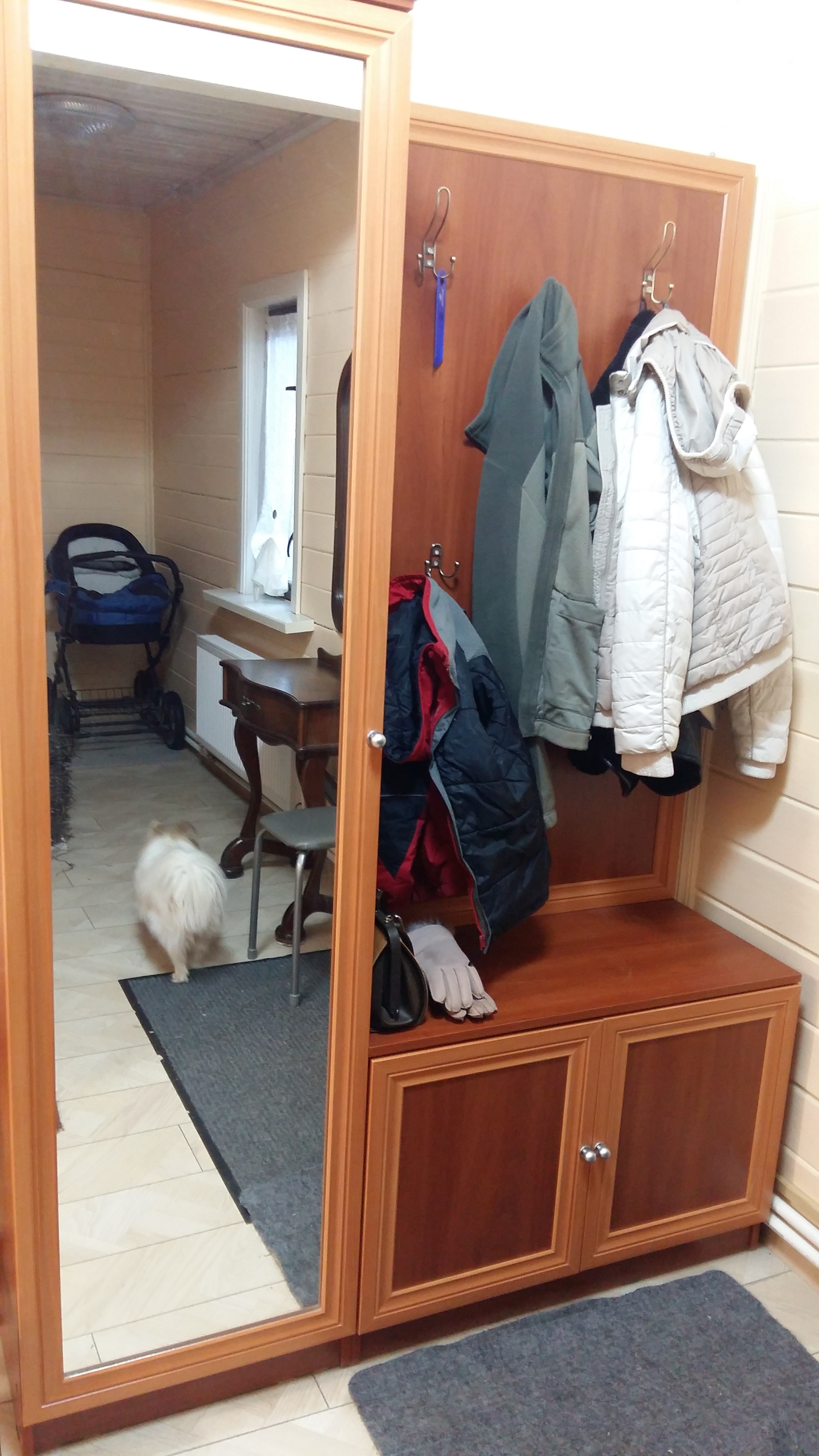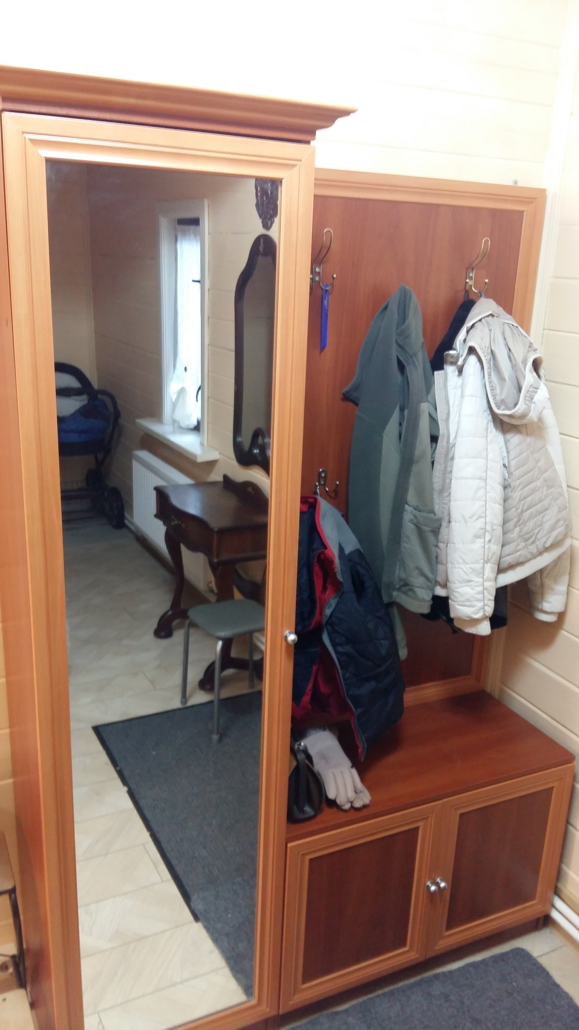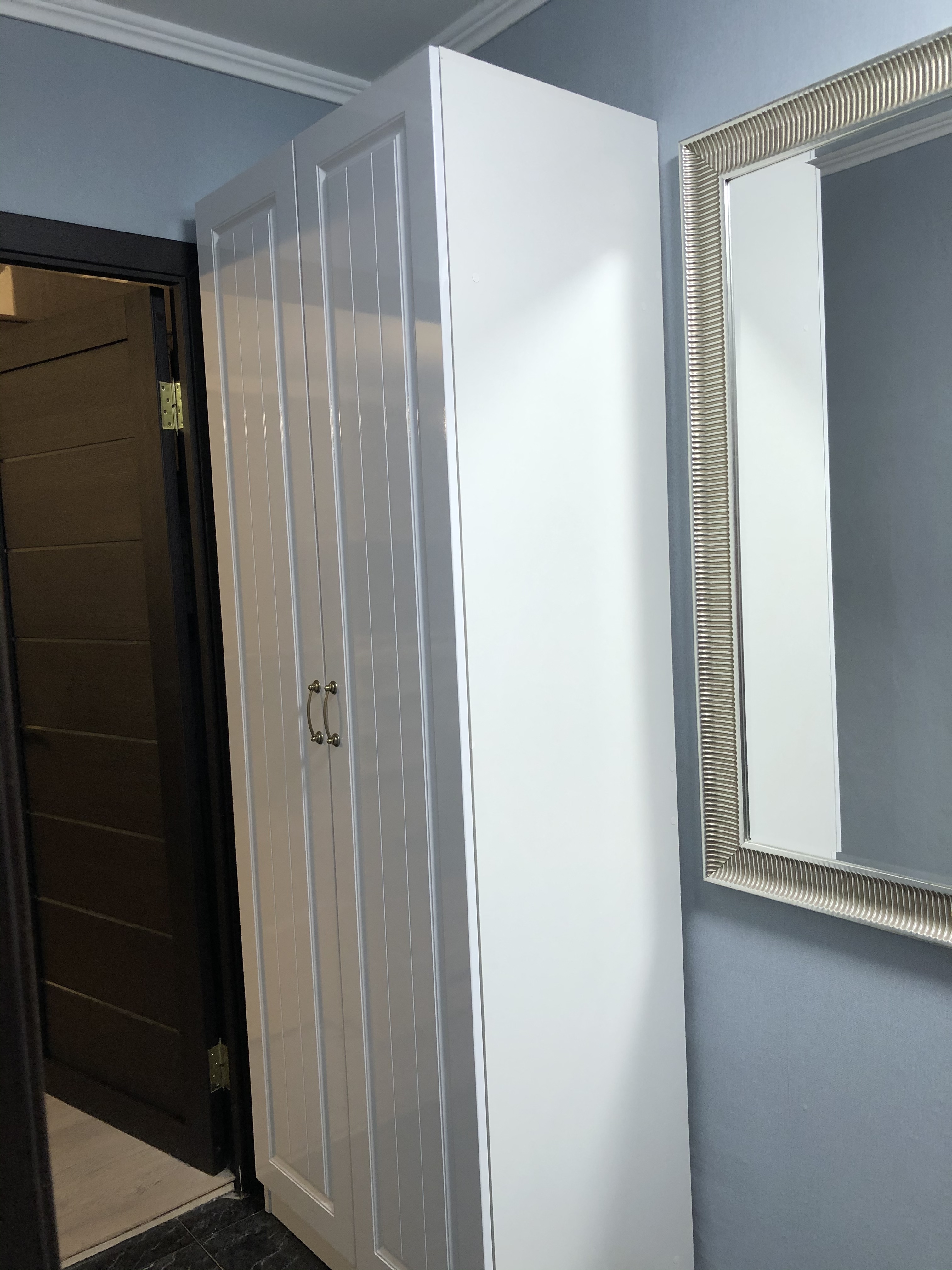 Неглубокая прихожая в узкий коридор. Заказал нестандартную высоту 2600 мм. и два зеркала на двери шкафа. Конструктивная особенность шкафа такова (а может быть это недоработка технолога), что вид с верху выглядит в виде короба глубиной 70-100 мм. Так что пыль сверху смахнуть нельзя (только собирать). В целом доволен.