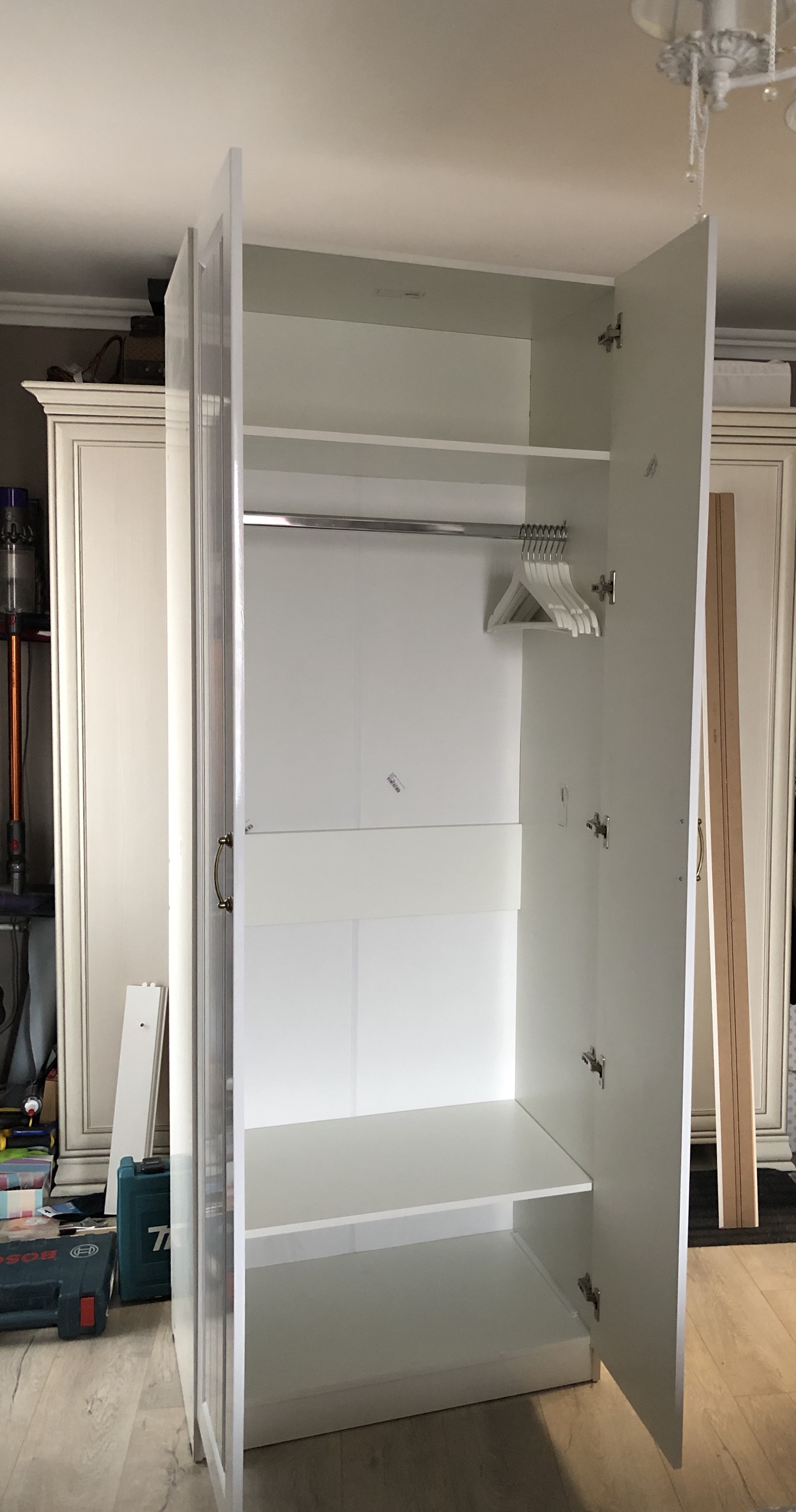 Заказал шкаф. Размеры нестандартные: 1100х2400х400. Дополнил комплектацию тремя полками. Получил три дополнительных ниши / один ярус  относительно стандартного шкафа.